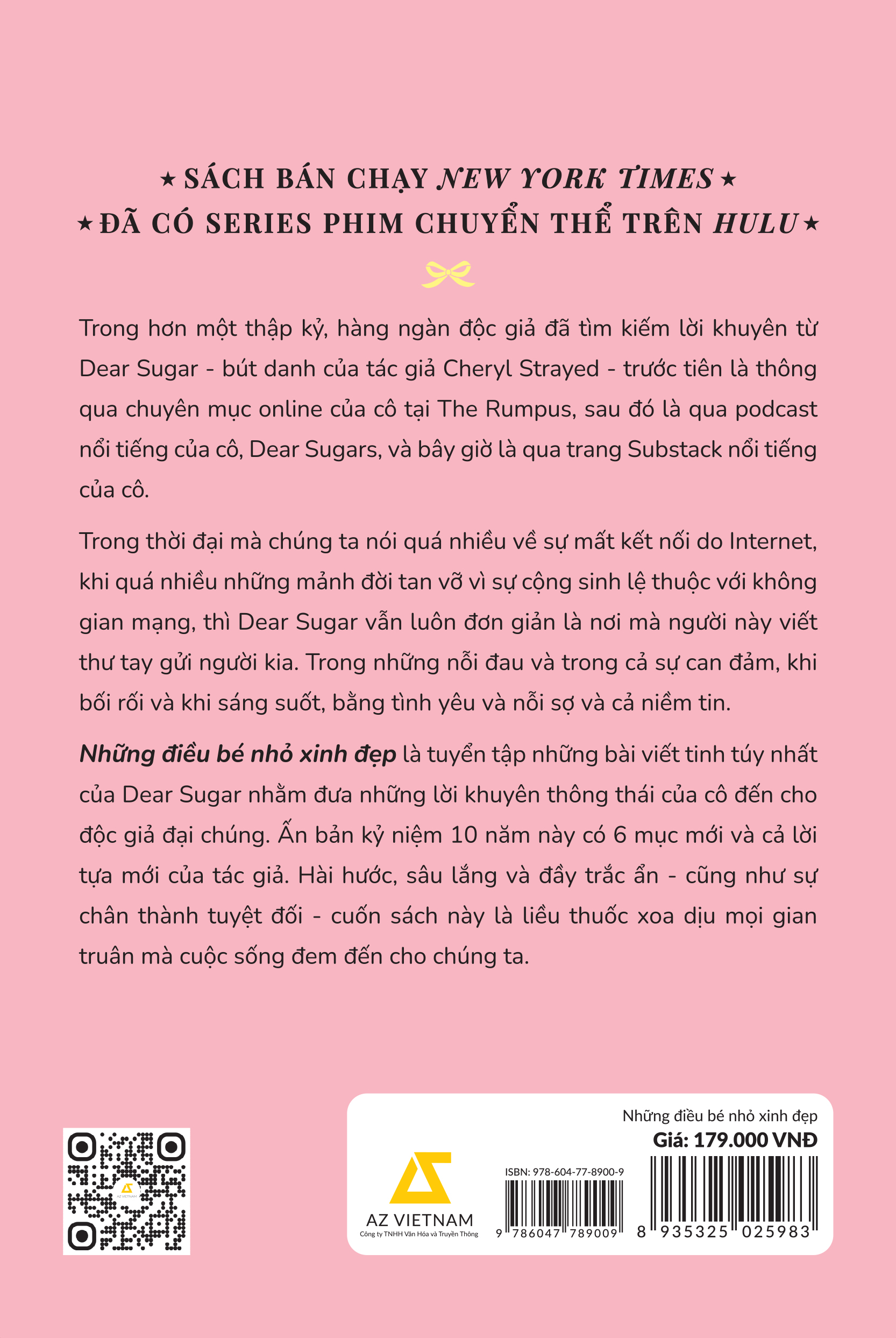 Những điều bé nhỏ xinh đẹp là tuyển tập những bài viết tinh túy nhất của Dear Sugar nhằm đưa những lời khuyên thông thái của cô đến cho độc giả đại chúng. Ấn bản kỷ niệm 10 năm này có 6 mục mới và cả lời tựa mới của tác giả. Hài hước, sâu lắng và đầy trắc ẩn - cũng như sự chân thành tuyệt đối - cuốn sách này là liều thuốc xoa dịu mọi gian truân mà cuộc sống đem đến cho chúng ta.