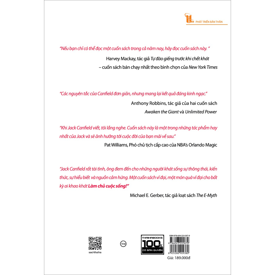 Tác giả: Jack Canfield là một diễn thuyết gia nổi tiếng, tốt nghiệp đại học Harvard, nhận bằng cao học của Đại học Massachusetts và học vị tiến sĩ của đại học Santa Monica. Năm 1973, ông được tổ chức Jaycees vinh danh là một trong mười người đàn ông xuất chúng của nước Mỹ.