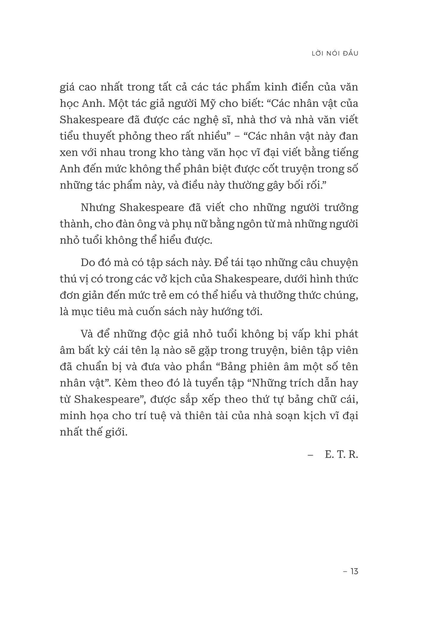 Ngoài ra, trong sách có thêm phần tiểu sử ngắn gọn của Shakespeare; hướng dẫn phát âm những tên khó đọc;