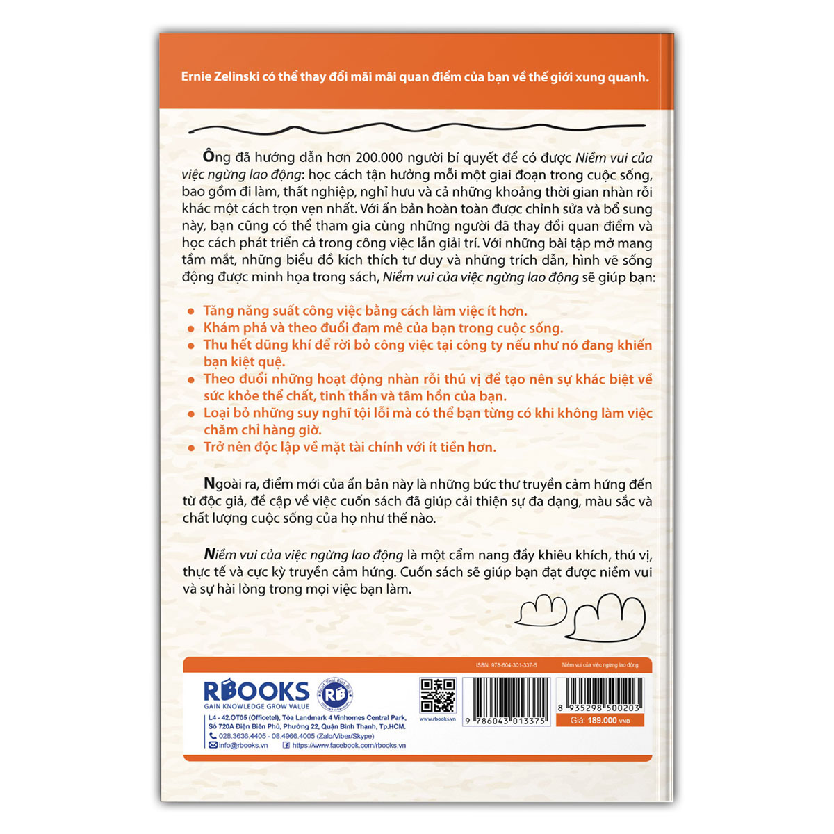 Bất kỳ một cuốn sách nào được viết ra đều hướng người đọc đến chân - thiện - mỹ; đều mong muốn độc giả của mình đạt được thành công ở một lĩnh vực nào đó. Cuốn sách của Ernie cũng không ngoài mục tiêu đó. Tuy nhiên, không giống hầu hết các cuốn sách hướng dẫn về chiến thắng khác, “Niềm vui của việc ngừng lao động” không chú trọng giúp bạn giành chiến thắng ở công việc hay kiếm tiền. Cuốn sách này nói về cách chiến thắng khi bạn ngừng làm việc ở một cách thức không ganh đua nhưng vẫn rất đáng tán dương. Bạn là người chiến thắng khi bạn có một niềm vui trong cuộc sống, khi bạn tận hưởng những thứ bạn đang làm, khi bạn tỉnh dậy vào mỗi buổi sáng và cảm thấy hào hứng về ngày hôm đó, và là khi bạn biết rõ về thứ mà bạn muốn thực hiện trong suốt cuộc đời này. Hãy để “Niềm vui của việc ngừng lao động” trở thành hướng dẫn xác thực và đáng tin cậy, giúp bạn học cách tận hưởng hạnh phúc của mỗi giai đoạn trong cuộc sống, dù bạn đang đi làm, thất nghiệp, đã nghỉ hưu, hay đơn giản chỉ là không muốn bỏ lỡ khoản thời gian nhàn rỗi mỗi cuối ngày. Với nhiều bài thực hành nhỏ, những biểu đồ kích thích tư duy, trích dẫn, và  hình vẽ sống động được minh họa, “Niềm vui của việc ngừng lao động” sẽ giúp bạn: