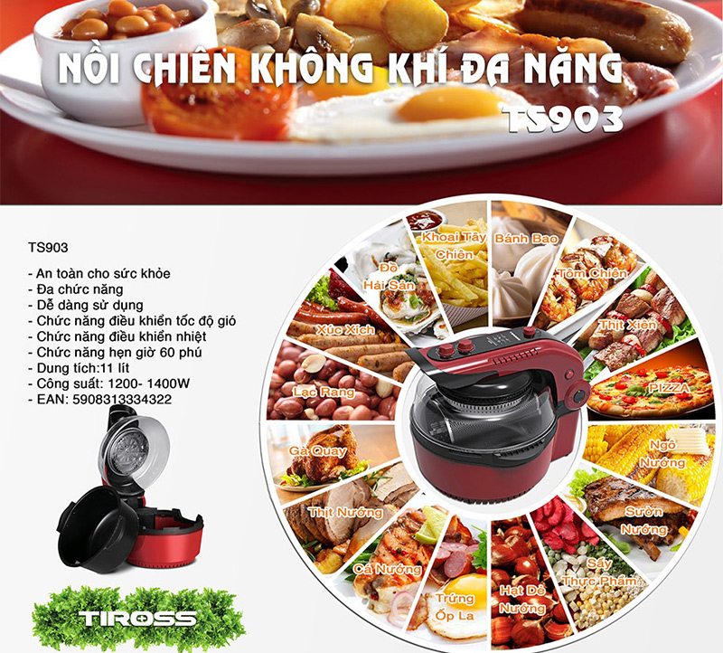 Nồi Chiên Không Khí Đa Năng Tiross TS903 - 11L (Đỏ Đen) sở hữu thiết kế tiện lợi với nhiều phụ kiện đa năng đính kèm như lồng chiên, trục xiên 360 độ, giá đỡ thực phẩm, giúp bạn nấu chín thực phẩm theo nhiều cách khác nhau mà vẫn đảm bảo thức ăn thơm ngon.