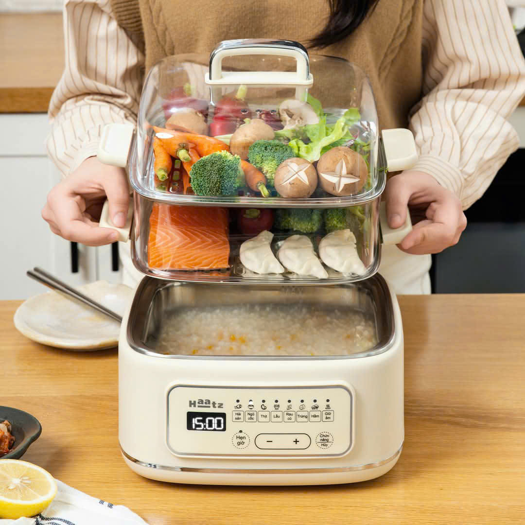Haatz là một thương hiệu gia dụng uy tín tại Hàn Quốc, nhận được sự tin tưởng, đồng hành của hàng triệu người dùng tại xứ sở kim chi. Có mặt tại Việt Nam từ năm 2024, Thương hiệu đồ gia dụng Haatz luôn mong muốn mang đến cho người tiêu dùng những trải nghiệm tốt nhất khi sử dụng mỗi sản phẩm, hướng tới sự hài lòng và an tâm của khách hàng Việt MÔ TẢ SẢN PHẨM NỒI HẤP 2 TẦNG HAATZ đa năng là sự lựa chọn hoàn hảo cho gia đình bạn. Với thiết kế hiện đại, chất liệu cao cấp và công nghệ tiên tiến, sản phẩm này không chỉ giúp bạn nấu ăn nhanh chóng mà còn giữ được hương vị và dinh dưỡng của thực phẩm. ĐẶC ĐIỂM NỔI BẬT Thiết Kế 2Tầng Tiện Lợi: Nồi hấp 3 tầng giúp bạn nấu nhiều món ăn cùng một lúc, tiết kiệm thời gian và năng lượng. Chất Liệu Cao Cấp: Nồi được làm từ chất liệu inox cao cấp, an toàn cho sức khỏe, bền đẹp và dễ vệ sinh. Công Suất Mạnh Mẽ: Với công suất mạnh mẽ, nồi hấp nhanh chóng đạt đến nhiệt độ cần thiết, đảm bảo thực phẩm chín đều và giữ nguyên hương vị tự nhiên. Dễ Dàng Sử Dụng Nồi có bảng điều khiển dễ hiểu, cho phép bạn điều chỉnh thời gian và nhiệt độ một cách chính xác, sử dụng màn hình cảm ứng tiện lợi Thiết Kế Thông Minh: Nắp kính trong suốt giúp bạn dễ dàng quan sát quá trình nấu ăn mà không cần mở nắp, giữ được nhiệt độ và hơi nước. LỢI ÍCH KHI SỬ DỤNG Tiết Kiệm Thời Gian: Với nồi hấp 2 tầng, bạn có thể nấu nhiều món ăn cùng một lúc, giúp tiết kiệm thời gian nấu nướng. Giữ Nguyên Dinh Dưỡng:Nồi hấp giúp thực phẩm giữ được hương vị và dinh dưỡng tự nhiên, tốt cho sức khỏe. -Đa Dạng Món Ăn:Bạn có thể hấp rau, cá, thịt, bánh bao và nhiều món ăn khác một cách dễ dàng.