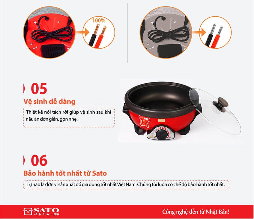 - Công nghệ Nhật Bản - Sản xuất tại Việt Nam! THÔNG SỐ KỸ THUẬT STT Thông Số Kỹ Thuật SATO 35NL31 1 Dung tích 3.5 lít 2 Màu sắc Đỏ 3 Chất liệu lòng nồi Nhôm 4 Nút điều khiển Nút vặn - cơ 5 Chức năng Lẩu, chiên, xào, rán, hấp, luộc 6 Chất liệu thân nồi Hợp kim nhôm cao cấp 7 Nắp vung Vung kính trong suốt 8 Điện áp 220V / 50HZ 9 Công suất 1,300 W 10 Trọng lượng 2.8 Kg 11 Kích thước 365 x 170 x 375(mm) 12 Thương hiệu SATO 13 Sản xuất tại Việt Nam 14 Xuất xứ Việt Nam 15 Tính năng khác Công nghệ đến từ Nhật Bản - Sản xuất tại Việt Nam!