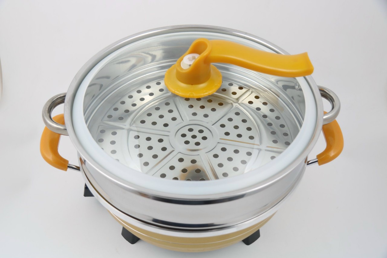 Chảo Điện Đa Năng Nấu Lẩu 2 Tầng Hấp Màu vàng sang trọng. Chảo điện đa năng thiết kế rất thông minh Bề mặt chảo chống dính rộng giúp nấu ăn được nhiều hơn trong một lần