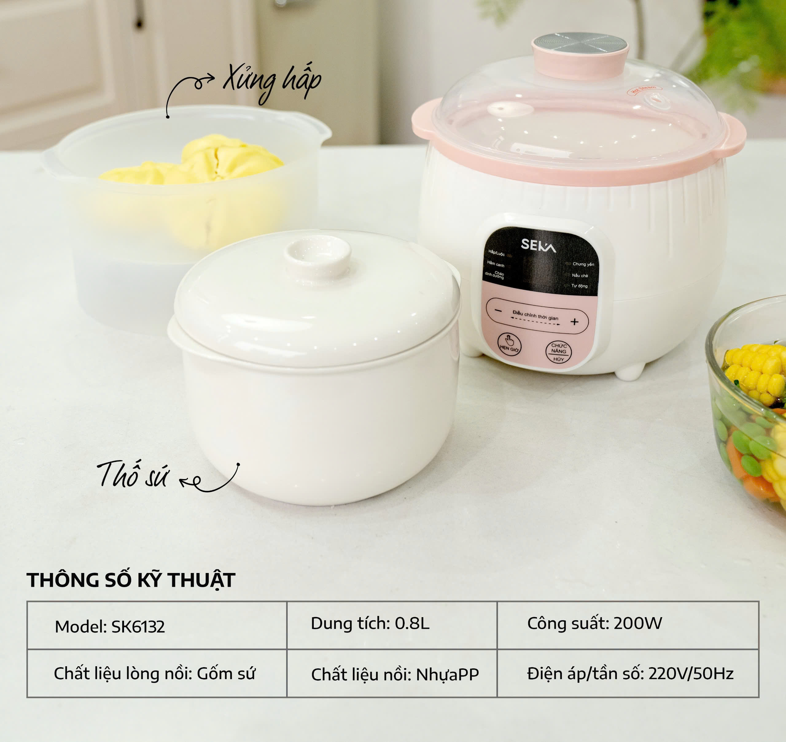 Công suất 200W Điện áp đầu vào 220V-240V/50Hz Dung tích 3,5 Lít Màu sắc màu trắng Đa chức năng : Kho cá, hầm xương, chưng yến, sắc thuốc bắc, nấu cháo ... Bảng điều