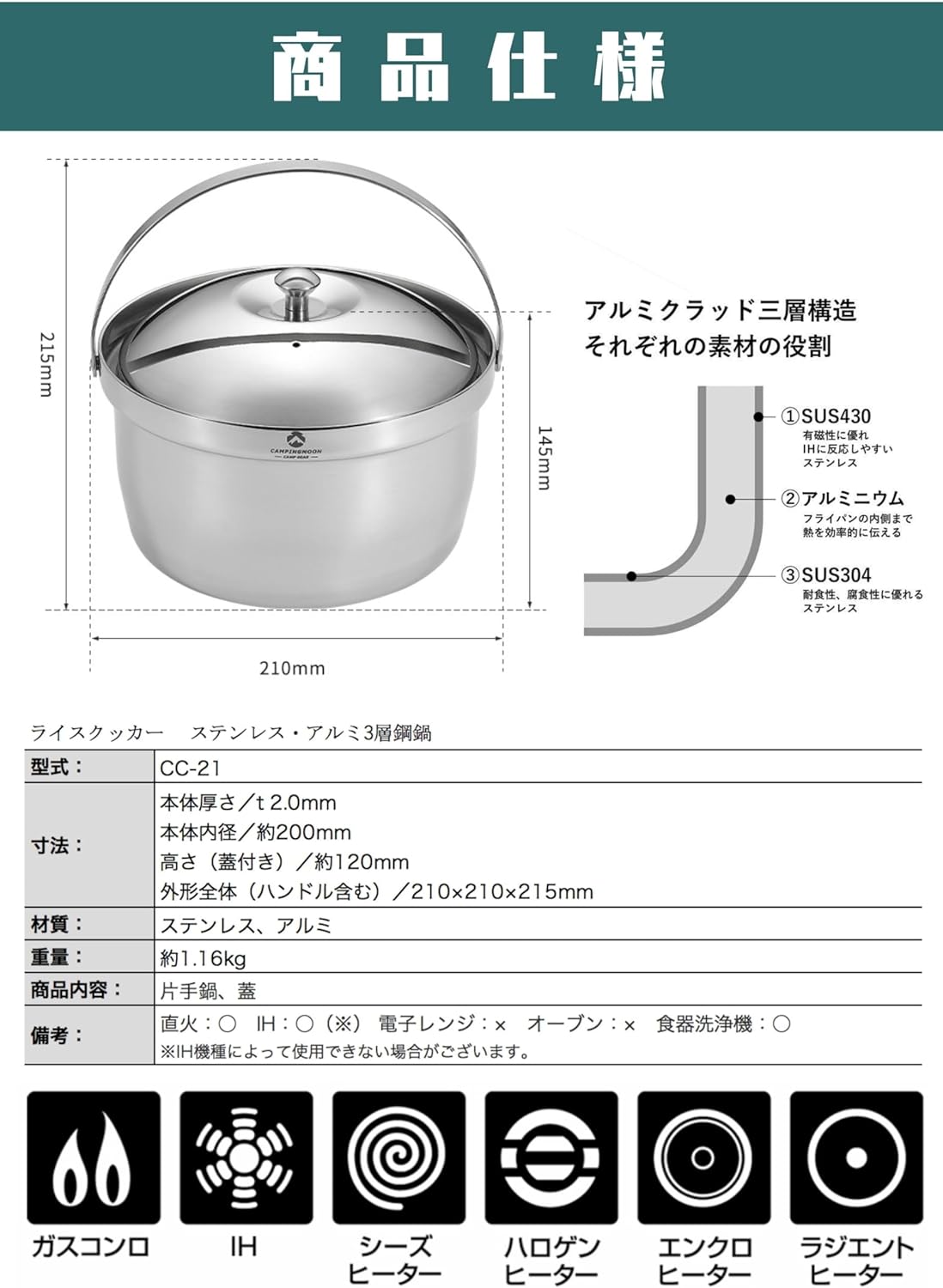 ✨Nồi nấu súp thép không gỉ 3 lớp Campingmoon CC-21 (3 lít)