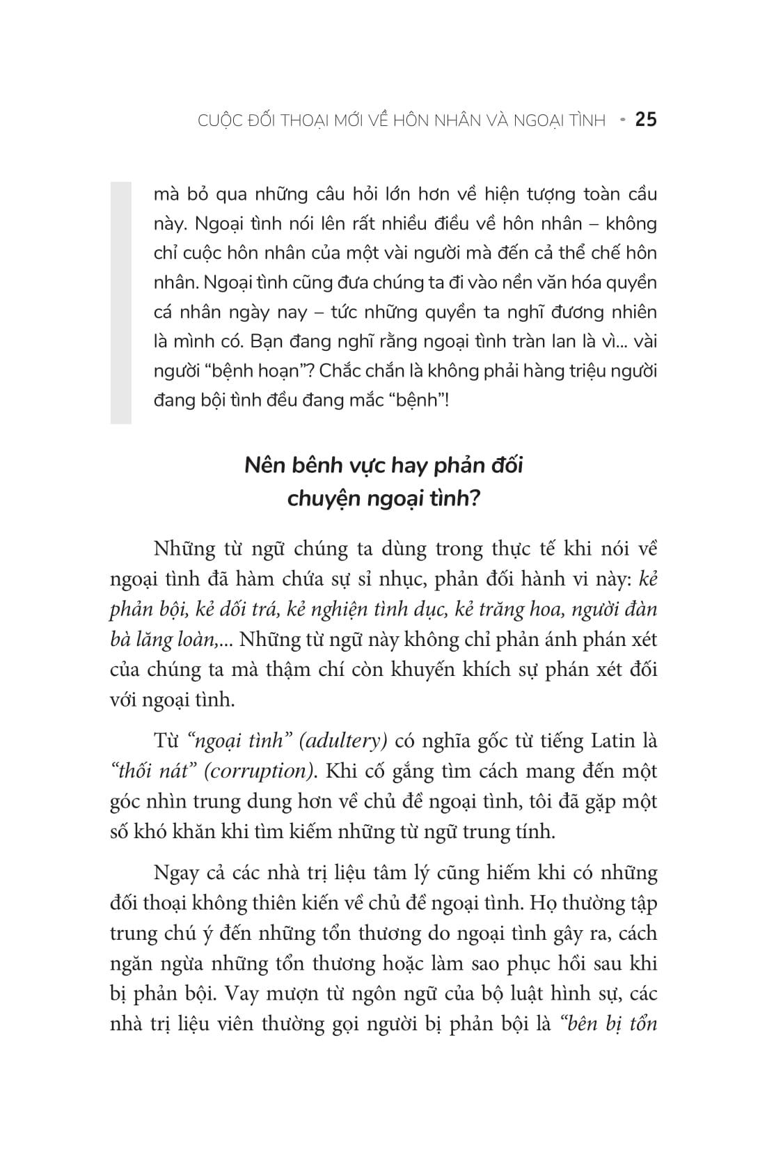 Ngày nay một cuộc đối thoại về các mối quan hệ bất chính dễ mang tính chia cắt, phán xét, và có lối suy nghĩ thiển cận. Xét dưới góc một nền văn hóa, chúng ta chưa khi nào cởi mở về tình dục hơn ngày nay, nhưng sự bội bạc vẫn còn chìm khuất đằng sau một đám mây của sự hổ thẹn và giấu giếm. Tôi hy vọng quyển sách này sẽ giúp xua đi sự im lặng ấy và mở ra một lối suy nghĩ và diễn đạt mới mẻ cho một trong những điều xưa cổ nhất trong cuộc sống của con người. Rất nhiều người đã viết ra cách ngăn ngừa và chữa lành sau khi sự đã xảy ra; nhưng ít ai viết về ý nghĩa và động cơ của các mối quan hệ bất chính. Càng ít hơn nữa những người nói về những điều mà chúng ta có thể học được từ các mối quan hệ và làm thế nào để kiến thức ấy có thể biến đổi và hoàn thiện các mối quan hệ của chúng ta.