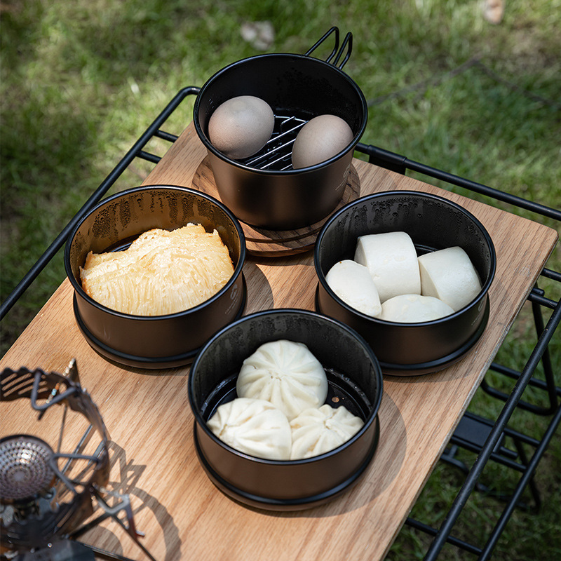 cắm trại Sierra mini Campingmoon BKS-S362 chất liệu Inox 304 mạ lớp Titanium đen không gỉ sét, dễ lau chùi. Có thể xếp chồng nhiều lớp nhiều không gian hơn và hấp nhiều món ăn cùng 1