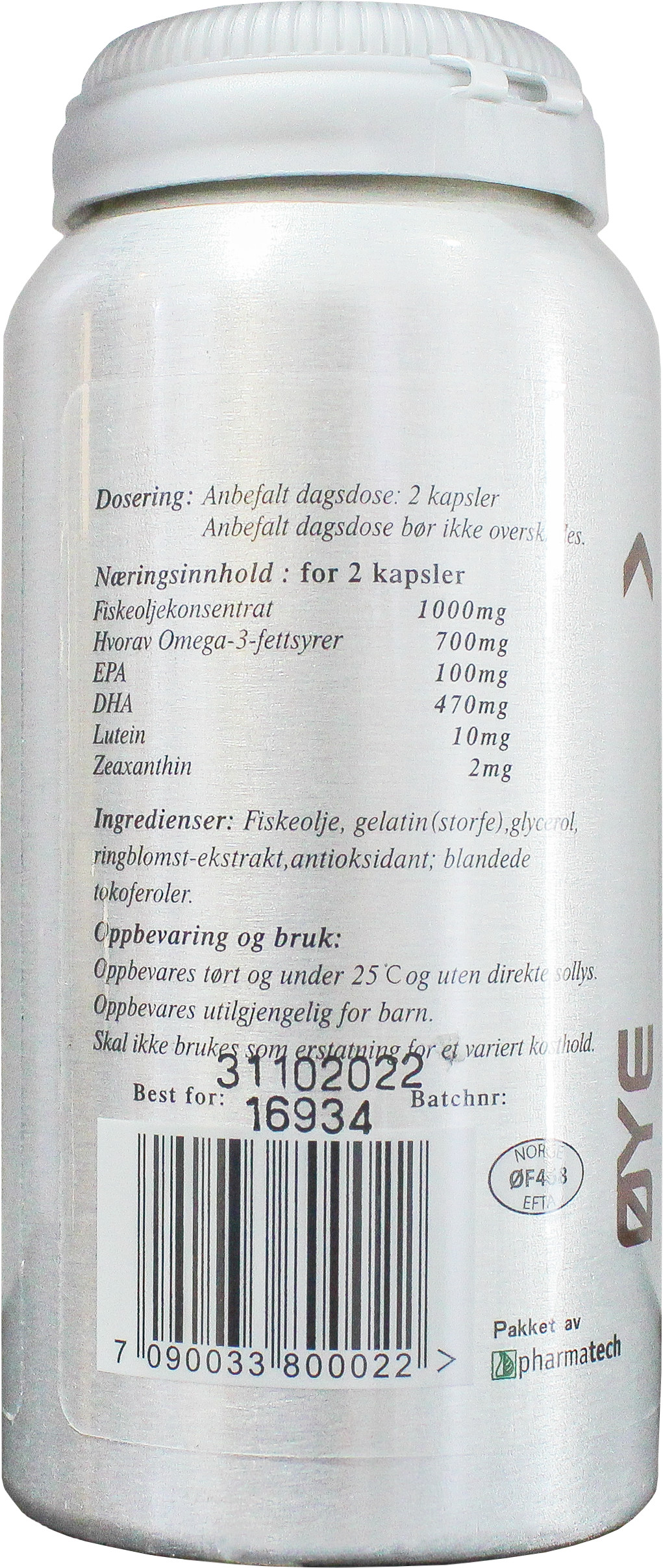 Dầu Cá Norsk Omega 3 ØYE 90 Viên THÀNH PHẦN: Thành phần có trong 2 kapsler NORSK ØYE Fiskeoljekonsentrat 1000mg Hvorav Omega-3-fettsyrer 700mg EPA 100mg DHA 470mg Lutein 10mg Zeaxanthin 2mg - Ingredienser:Fiskeolje,gelatin(storfe) - glycerol,