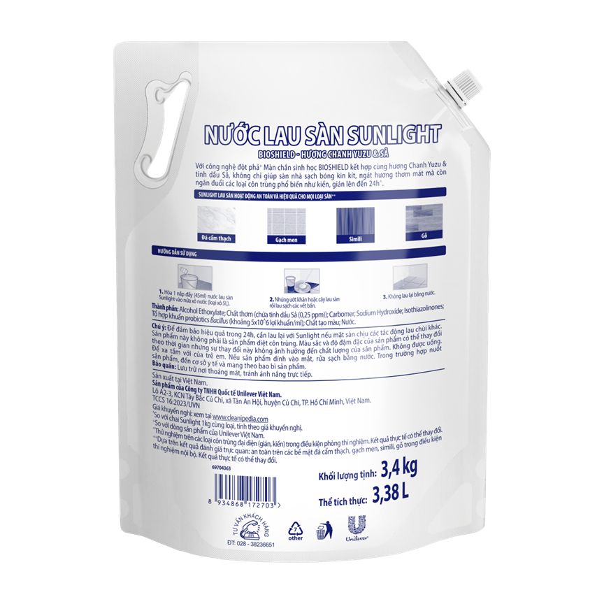 - Bước 3: Không lau lại bằng nước. Xuất xứ thương hiệu: Sản xuất tại Việt Nam - Sản phẩm của Công ty TNHH Quốc Tế Unilever Việt Nam. Thành phần (Hương Chanh Yuzu & Sả): Alcohol Ethoxylate; Chất thơm (chứa tinh dầu Sả (0.25ppm)); Carbomer; Sodium Hydroxide; Isothiazolinones; Tổ hợp khuẩn probiotics Bacillus (khoảng 5x10^6 lợi khuẩn/ml); Chất tạo màu; Nước. Chú ý: Để đảm bảo hiệu quả trong 24h, cần lau lại với Sunlight nếu mặt sàn chịu các tác động lau chùi khác. Sản phẩm này không phải là sản phẩm diệt côn trùng. Màu sắc và độ đậm đặc của sản phẩm có thể thay đổi theo thời gian nhưng sự thay đổi này không ảnh hưởng đến chất lượng của sản phẩm. Hạn sử dụng: 3 năm kể từ ngày sản xuất Quy cách: Túi, 3.4kg Hướng dẫn bảo quản: Nơi thoáng mát, tránh ánh nắng trực tiếp ** Dựa trên kết quả đánh giá trực quan: an toàn trên các bề mặt đá cẩm thạch, gạch men, simili, gỗ trong điều kiện thí nghiệm nội bộ. Kết quả thực tế có thể thay đổi.