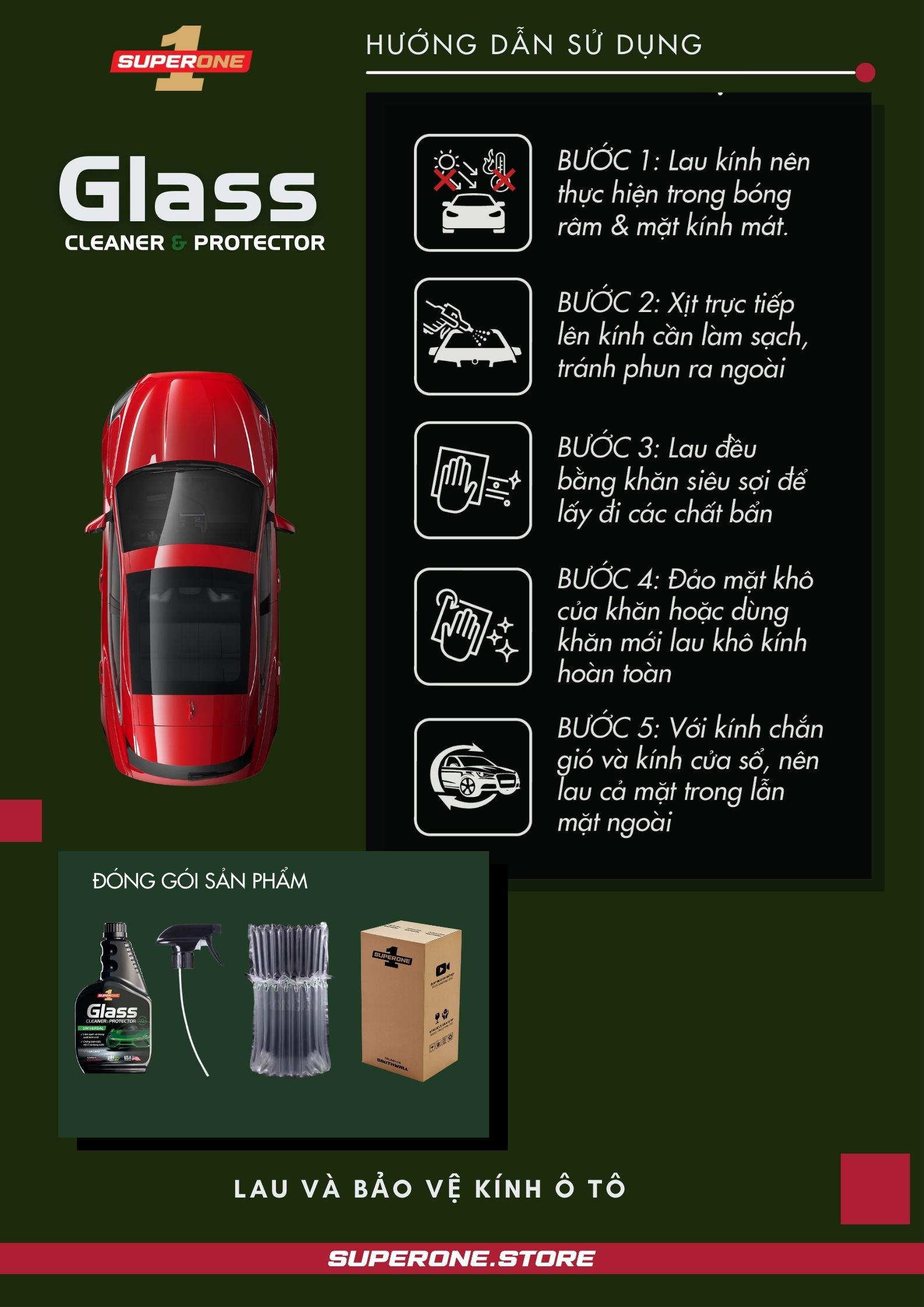LÀM SẠCH VÀ TRONG SUỐT KÍNH Ô TÔ - CHỐNG BÁM BẨN, VỆT Ố VÀ ĐỌNG NƯỚC Nước Lau Và Bảo Vệ Kính Super One Glass Cleaner and Protector - Universal, một công thức chuyên nghiệp với khả năng làm sạ...