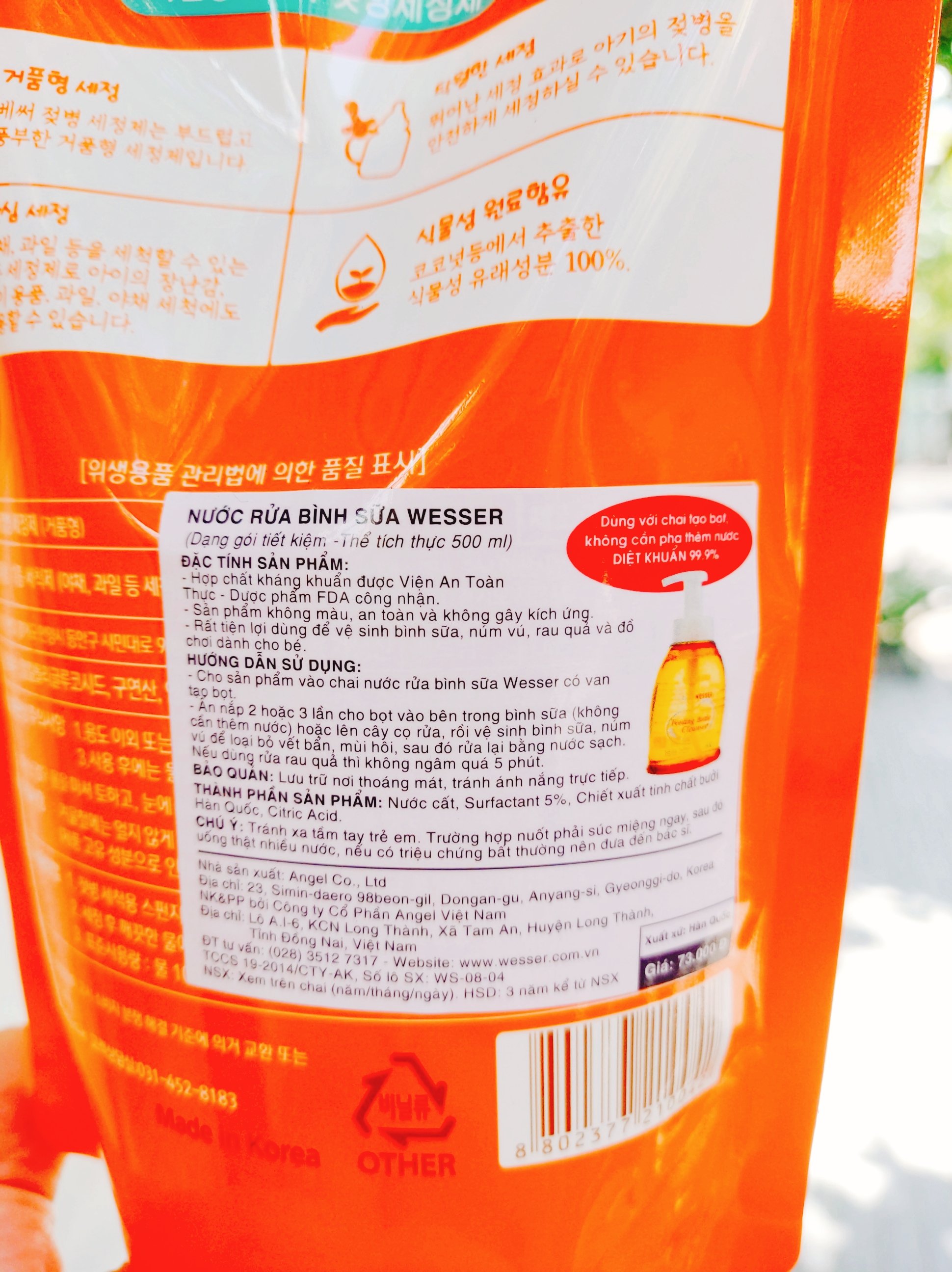 - Nước Rửa Bình Sữa Wesser Dạng Gói (500ml) tiết kiệm hơn khi sử dụng. - Dung dịch giúp vệ sinh bình sữa dễ dàng, an toàn, kháng khuẩn, tiêu diệt các loại vi khuẩn xâm