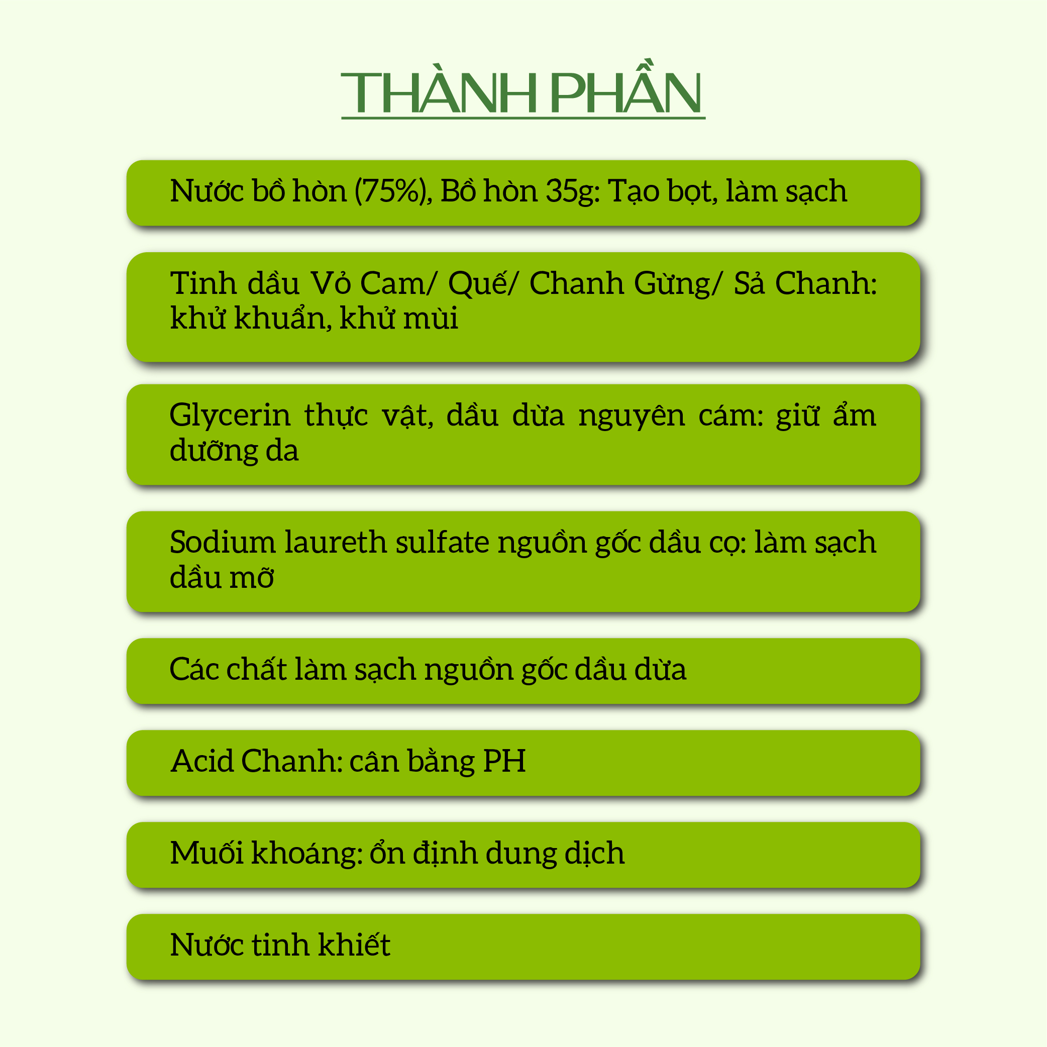 • Nước bồ hòn (75%) + Bồ hòn 35g (Tạo bọt và làm sạch)