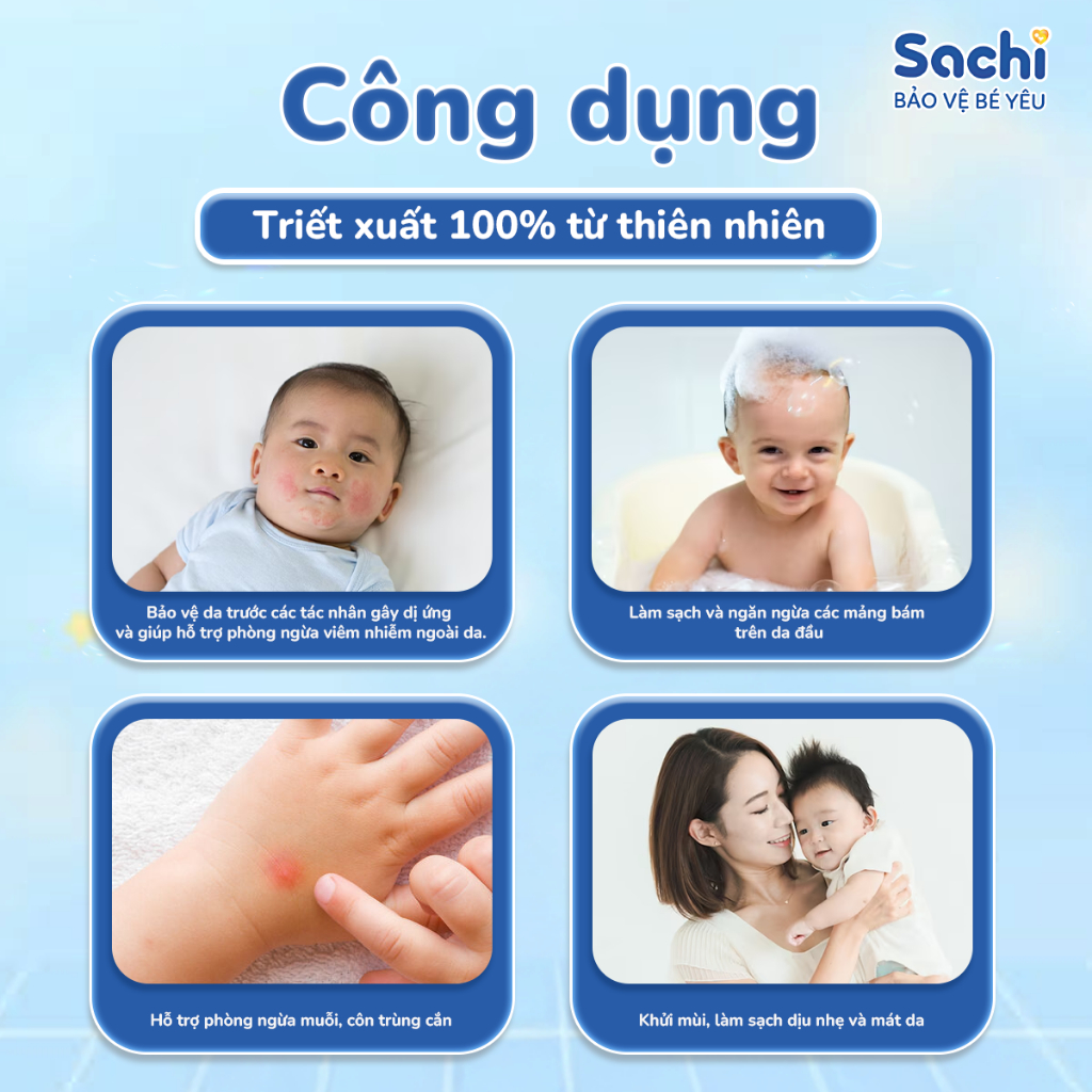 - Bảo vệ da trước các tác nhân gây dị ứng và giúp hỗ trợ trong việc phòng một số trường hợp viêm ngoài da ở trẻ sơ sinh và trẻ nhỏ như hăm da, mụn nhọt, mẩn ngứa, rôm sảy, mề đay…cho làn da trông sáng sạch, khỏe mạnh hơn