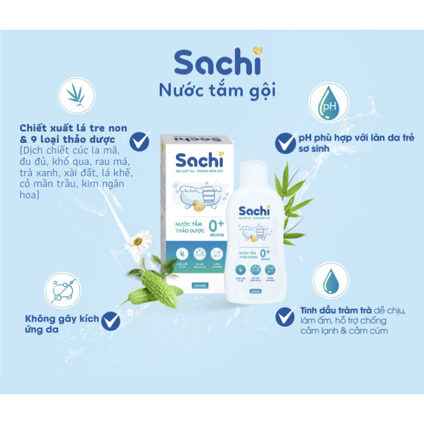 - Nước tắm Sachi có nguồn gốc từ các loại thảo mộc có khả năng làm ấm người, hỗ trợ chống cảm lạnh hiệu quả, đặc biệt là đối với trẻ nhỏ. Đối tượng sử dụng sản phẩm Dùng tắm gội hàng ngày cho trẻ sơ sinh trở lên, đặc biệt là trẻ có làn da nhạy cảm từ 0-3 tuổi. Cách sử dụng