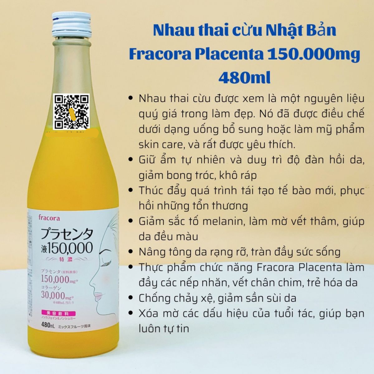 - Và các loại tinh chất vitamin tốt cho da. Các thành phần có trong Nước Uống Đẹp Da Fracora Placenta 150000mg Collagen 30000mg mang lại cho bạn những gì? Tinh Chất Nhau Thai Cừu Fracora Placenta 150000mg cho bạn làn da mịn màng không tỳ vết - Tinh chất nhau thai cừu: giúp kích thích tại tạo tế bào da, bổ sung độ ẩm, làm lành các vùng da bị tổn thương nhanh chóng, cho bạn làn da mềm mại, mịn màng và cơ thể khỏe đẹp.