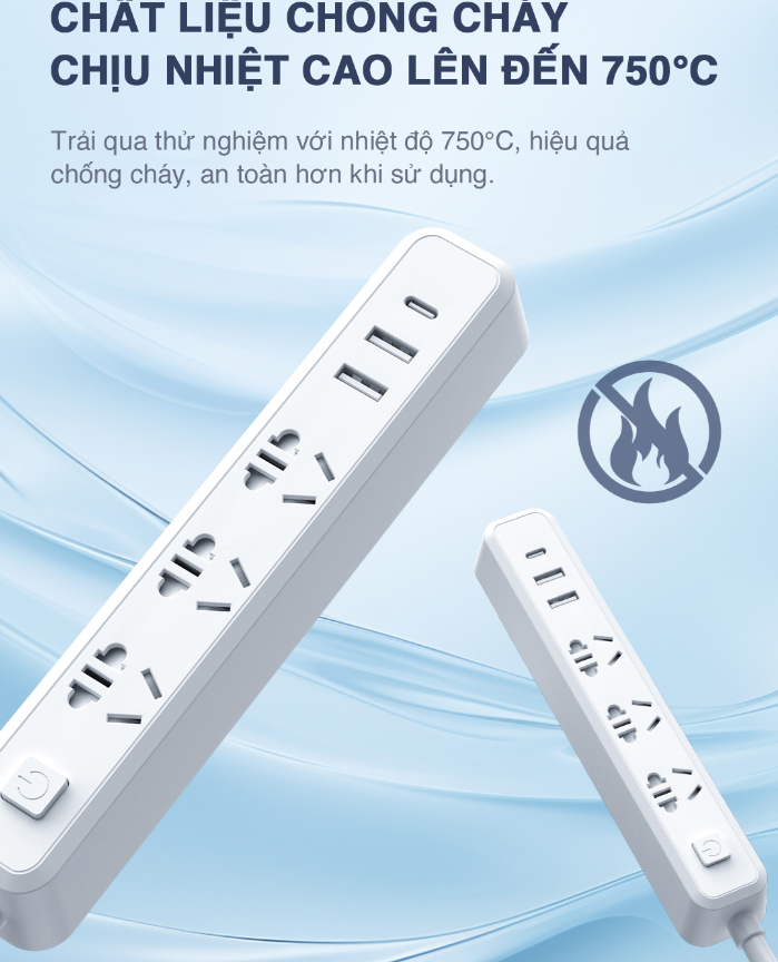 Ổ cắm 3 ổ đa năng + 2 ổ cắm USB cách điện bền đẹp - Chịu nhiệt, chống cháy: 750 độ C - Chiều dài dây điện: 1.8 mét - Chân tiếp xúc với