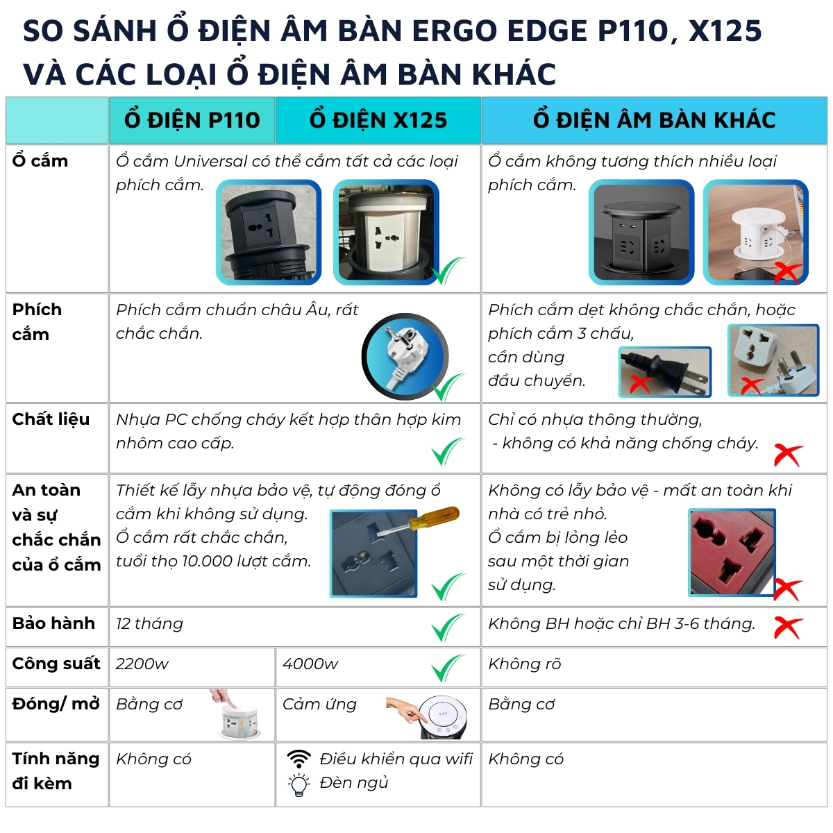 X125, công suất tối đa 4000w: tương tự P110 nhưng cao cấp hơn, có khả năng kết nối qua wifi và khả năng đóng mở bằng 1 chạm – không cần nhấn. Phiên bản ổ điện âm bàn cao cấp nhất, cũng có thể lắp đặt với bàn làm việc, bàn ăn, bàn bếp… - Công suất tối đa của X125 lên đến 4000W, tương đương 2 nồi lẩu.