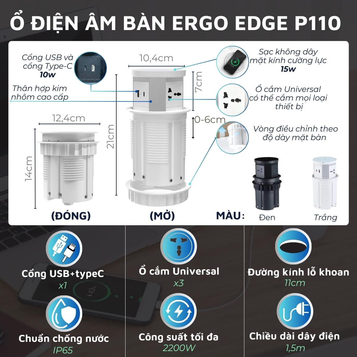 P110, công sất tối đa 2200w: ổ điện thông minh với sạc nhanh không dây 15W. Cùng với 3 phích cắm và 1 cổng USB + 1 cổng typeC. Đóng mở bằng 1 lần nhấn. Bạn có thể lắp đặt P110 với bàn làm việc, bàn ăn, bàn bếp… Lưu ý công suất tối đa của P110 là 2200W, tương đương 1 nồi lẩu.