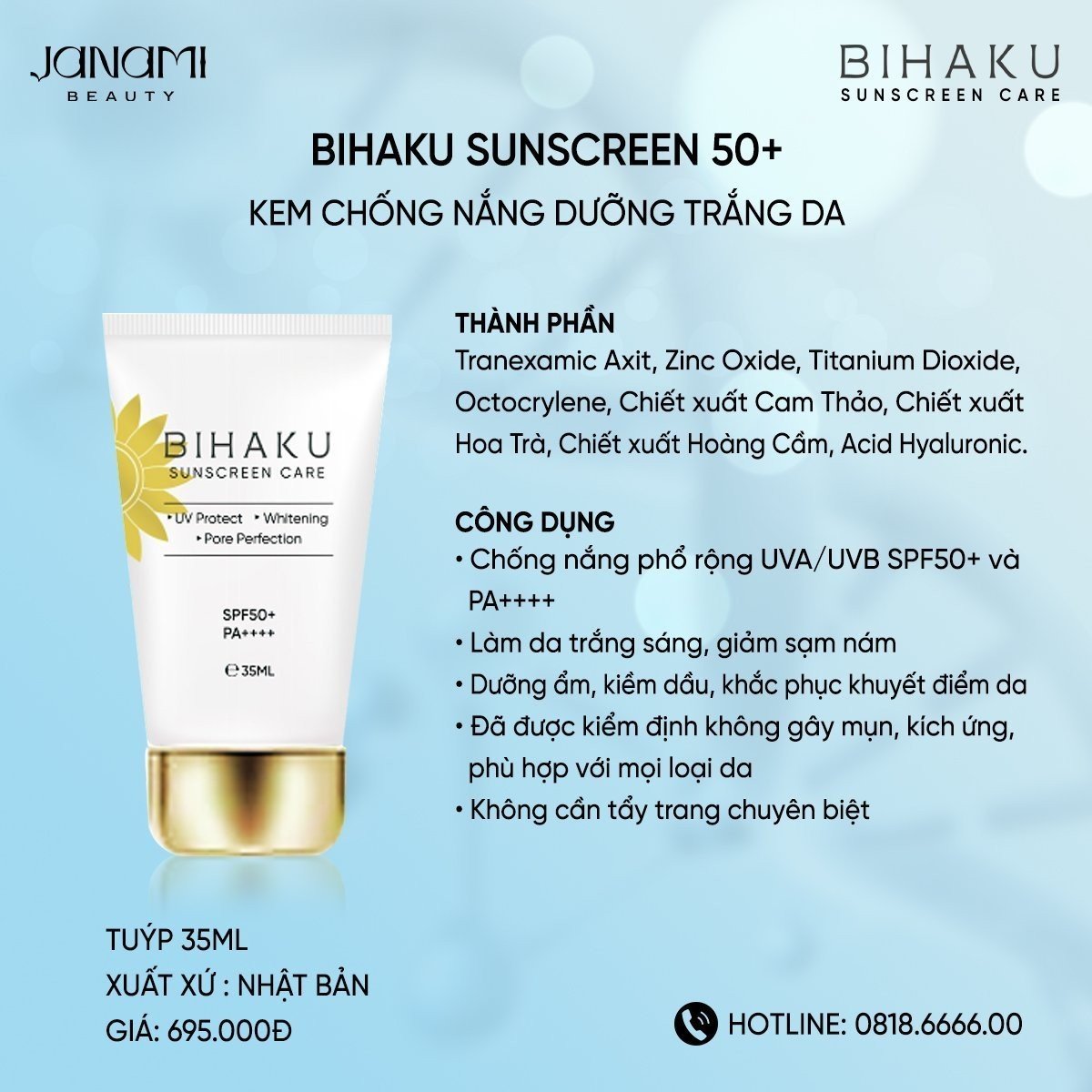 - CÔNG DỤNG Kem chống nắng Bihaku Sunscreen Care có thành phần chống nắng vật lý lai hóa học giúp chống nắng bảo vệ da khỏi UVA/UVB một cách toàn diện (SPF 50+, PA++++) và hạn chế tối đa vấn đề về cháy nắng.
