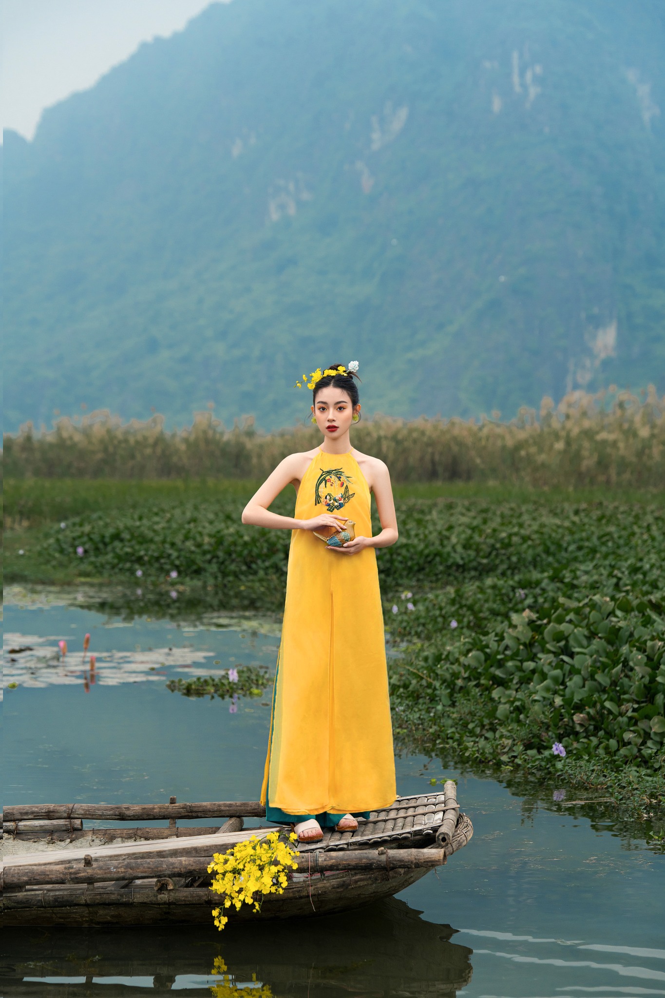 áo dài suông vàng được may bằng chất liệu lụa gấm loại 1 kết hoa và cườm, tay lỡ loe, quần lụa trắng