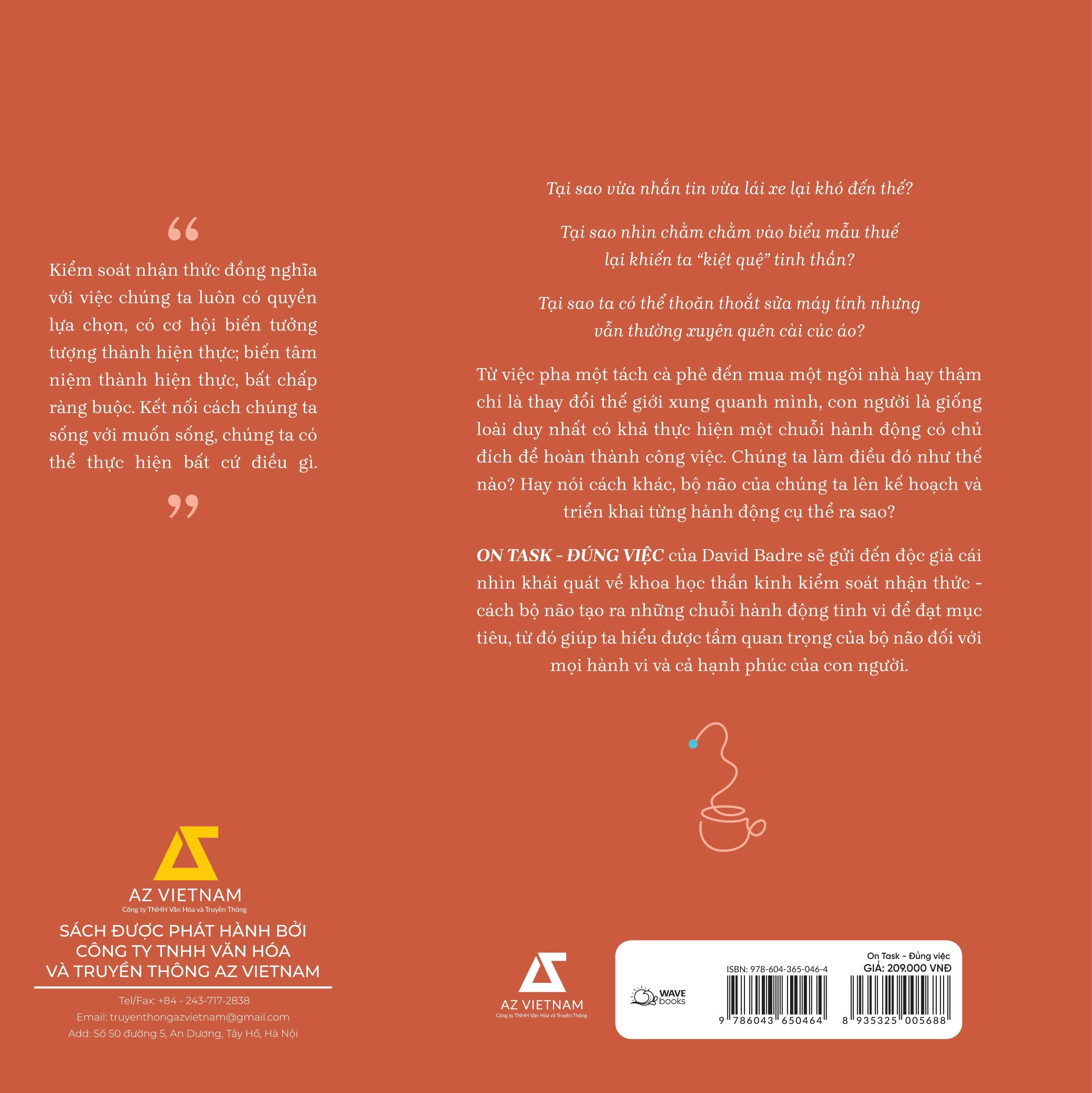 ON TASK - ĐÚNG VIỆC Bộ não chúng ta làm việc như thế nào? Tại sao vừa nhắn tin vừa lái xe lại khó đến thế? Tại sao nhìn chằm chằm vào biểu mẫu thuế lại khiến ta “kiệt quệ” tinh thần? Tại sao ta có thể thoăn thoắt sửa máy tính nhưng vẫn thường xuyên quên cài cúc áo? Từ việc pha một tách cà phê đến mua một ngôi nhà hay thậm chí là thay đổi thế giới xung quanh mình, con người là giống loài duy nhất có khả thực hiện một chuỗi hành động có chủ đích để hoàn thành công việc. Chúng ta làm điều đó như thế nào? Hay nói cách khác, bộ não của chúng ta lên kế hoạch và triển khai từng hành động cụ thể ra sao? ON TASK - ĐÚNG VIỆC của Tiến sĩ David Badre sẽ gửi đến độc giả cái nhìn khái quát về khoa học thần kinh kiểm soát nhận thức - cách bộ não tạo ra những chuỗi hành động tinh vi để đạt mục tiêu, từ đó giúp ta hiểu được tầm quan trọng của bộ não đối với mọi hành vi và cả hạnh phúc của con người. Sách được phát hành bởi thương hiệu sách trẻ Wavebooks với sứ mệnh trở thành người bạn đồng hành tin cậy cho quá trình phát triển kỹ năng và tâm hồn người Việt trẻ.