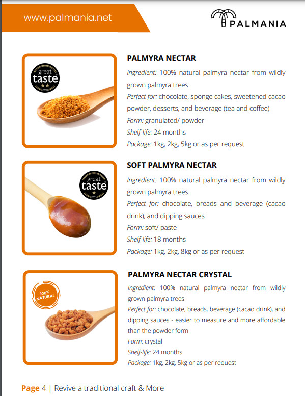 Cây thốt nốt mọc tự nhiên phải mất ít nhất 30 năm mới có thể thu hoạch được nước hoa để nấu mật. Mật thốt nốt hạt Palmania được làm từ 100% nguyên liệu tự nhiên và tuân theo nguyên tắc sản xuất bền vững.