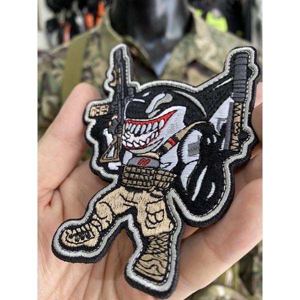 Patch_miếng dán velcro cá mập chiến thuật Có thể dán lên quần áo , túi xách , ba lô Hình thêu cực kỳ sắc sảo luôn ạ Kích thước : 7 x 8 cm Giá