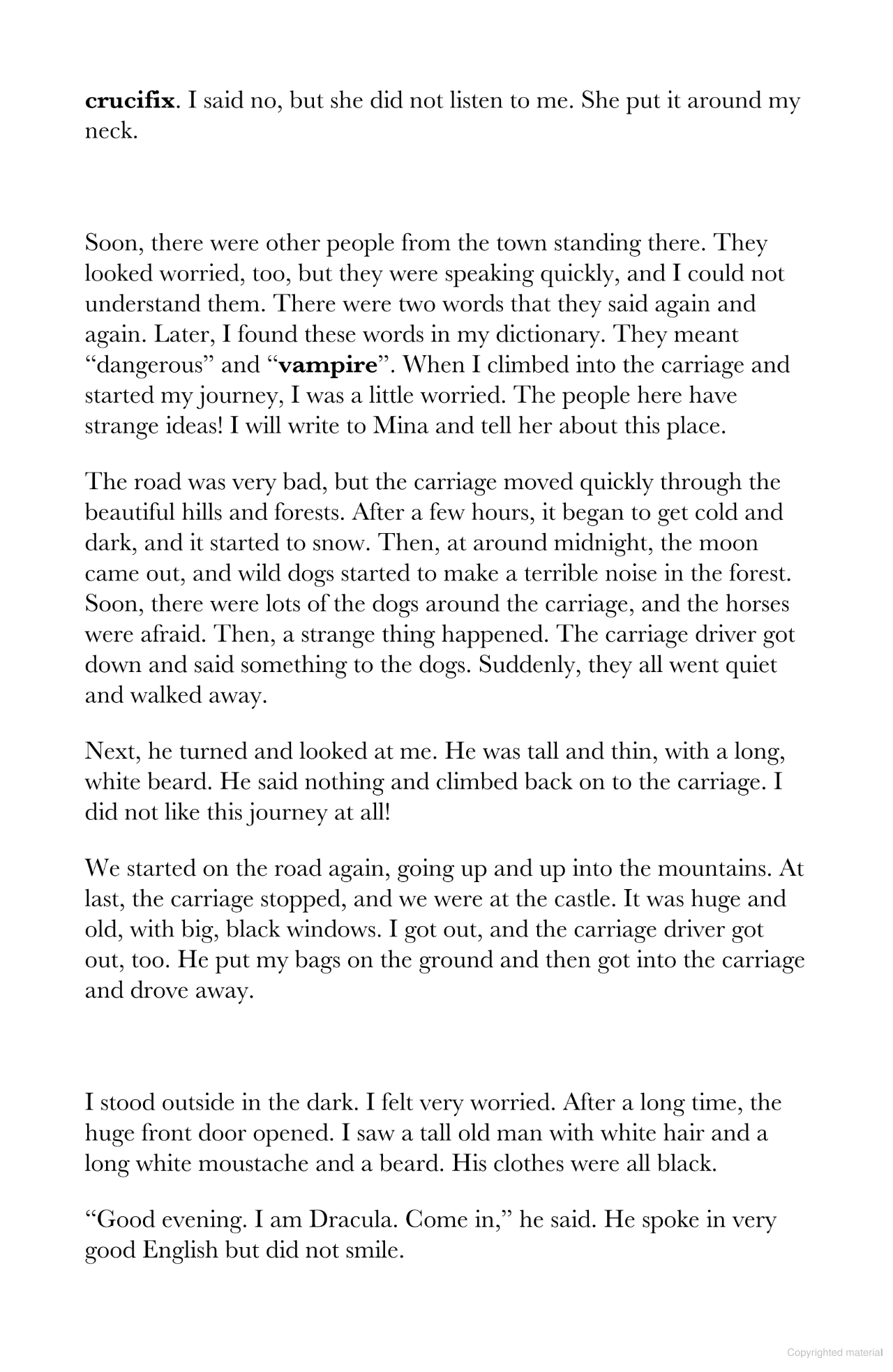 Dracula, a Level 3 Reader, is A2 in the CEFR framework. The text is made up of sentences with up to three clauses, introducing first conditional, past continuous and present perfect simple for general experience. It is well supported by illustrations, which appear on most pages.