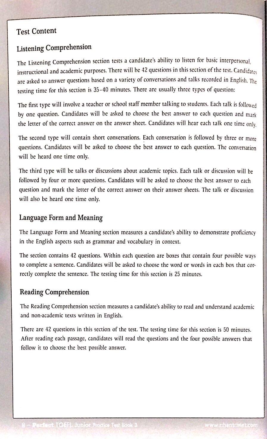 Master TOEFL Junior Basic A2 (Kèm CD) The TOEFL Junior was made to measure a non-native Enghlish speaker's. The test is divided into three sections: Listening Comprehension (42 question), Language Form and Meaning (42 question),