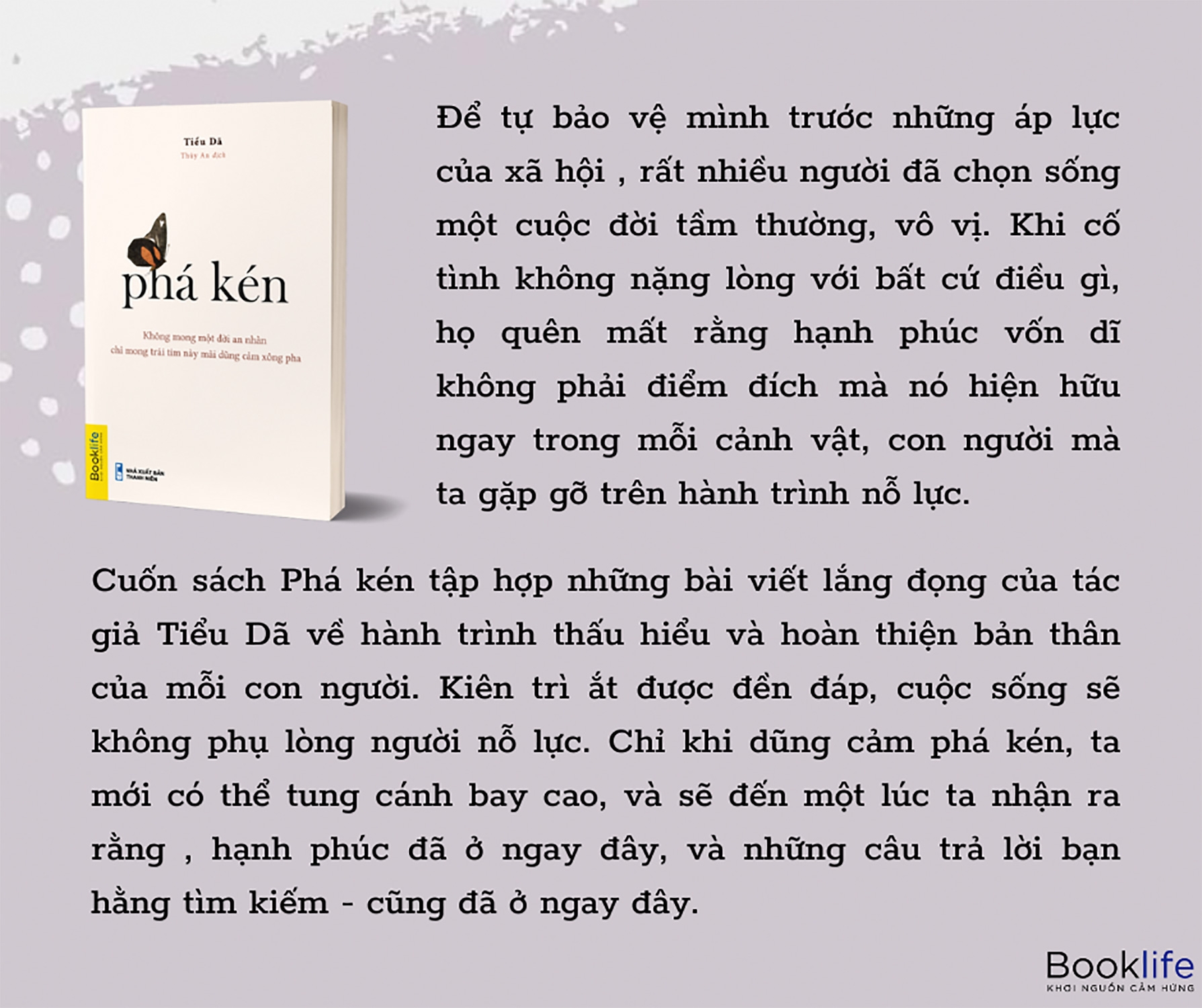 Cuốn sách Phá kéntập hợp những bài viết lắng đọng của tác giả Tiểu Dã về hành trình thấu hiểu và hoàn thiện bản thân của mỗi con người. Tất thảy mọi điều đều bắt đầu từ việc nuôi dưỡng nội tâm mạnh mẽ, để ý thức được rằng, cuộc sống sẽ không phụ lòng người nỗ lực. Hãy cứ mong muốn sống một cuộc đời cao quý hơn, vượt trên những điều tầm thường chán ngán. Sự cao quý ấy không đến từ vật chất, với nhà lầu xe hơi, với tiền tài danh vọng… Sự cao quý đích thực được xây đắp, tích lũy từng chút một từ tận đáy lòng, biểu hiện ở việc thấu hiểu bản thân, học cách trân trọng chính mình, có dũng khí sống độc lập và tự tạo ra niềm vui, học cách rung động trước những điều nhỏ bé giản dị…