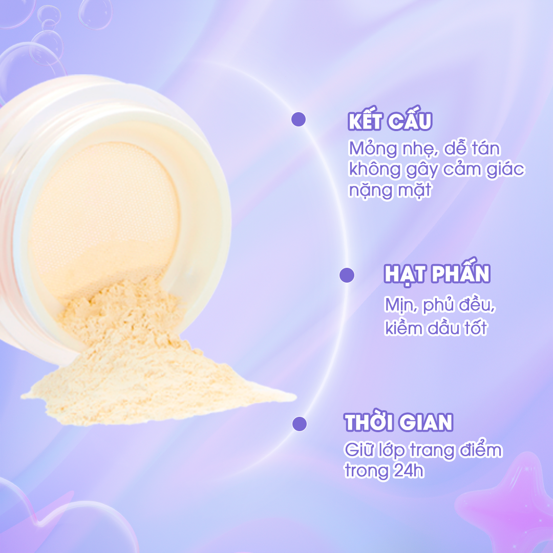 Mua tại TiktokTHÔNG TIN SẢN PHẨM Phấn phủ bột trang điểm myKella TINTED MAGIC C RYSTAL là sản phẩm trang điểm cao cấp, giúp kiểm soát dầu và làm mịn da hiệu quả. Sản phẩm không chỉ cố định lớp nền mà còn có thể sử dụng để cố định màu son đậm, làm dịu màu mắt hoặc má hồng quá tay. THÔNG SỐ KỸ THUẬT