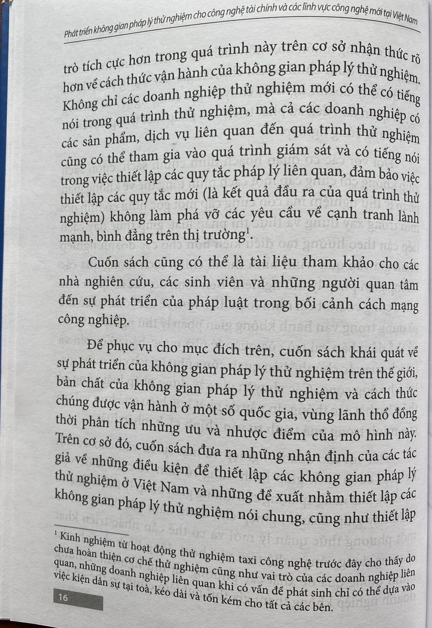 Từ những quan sát đó, nhóm làm việc của Viện Khoa học pháp lý và các chuyên gia từng cộng tác đã cùng nhau biên soạn cuốn sách: Phát triển không gian pháp lý thử nghiệm (Regulatory Sandbox) cho FinTech và các lĩnh vực công nghệ mới tại Việt Nam. Mục đích trước hết của cuốn sách này là cung cấp một nguồn tư liệu đáng tin cậy cho những người quản lý, các chuyên gia và công chúng về sự hình thành, phát triển, đặc điểm của các không gian pháp lý thử nghiệm, khả năng và những gợi ý cho việc thiết lập các không gian pháp lý thử nghiệm trong điều kiện ở Việt Nam. Mục đích này xuất phát từ mong muốn của chúng tôi là góp phần nhỏ bé của mình vào quá trình xây dựng, hoàn thiện pháp luật trong bối cảnh CMCN 4.0. Nhờ đó, Việt Nam có thể tận dụng được những sáng kiến về quản trị nhà nước đã được hình thành từ quá trình phát triển ở nhiều quốc gia trên thế giới như một cách để tận dụng được những thành tựu mới của cuộc cách mạng công nghệ.