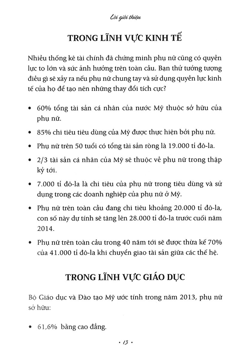 "Cùng với sự thay đổi ảnh hưởng của phụ nữ toàn cầu và những thay đổi trong cách thức kinh doanh đã được tạo ra, tôi tin rằng phụ nữ chúng ta đang ở điểm bùng phát của những cơ hội thành công. Trong những năm qua, nhiều phụ nữa đã chia sẻ với tôi rằng họ muốn có một cuốn sách định hướng liên quan đến họ và tác giả của nó là một người phụ nữ thành công trong cuộc sống.