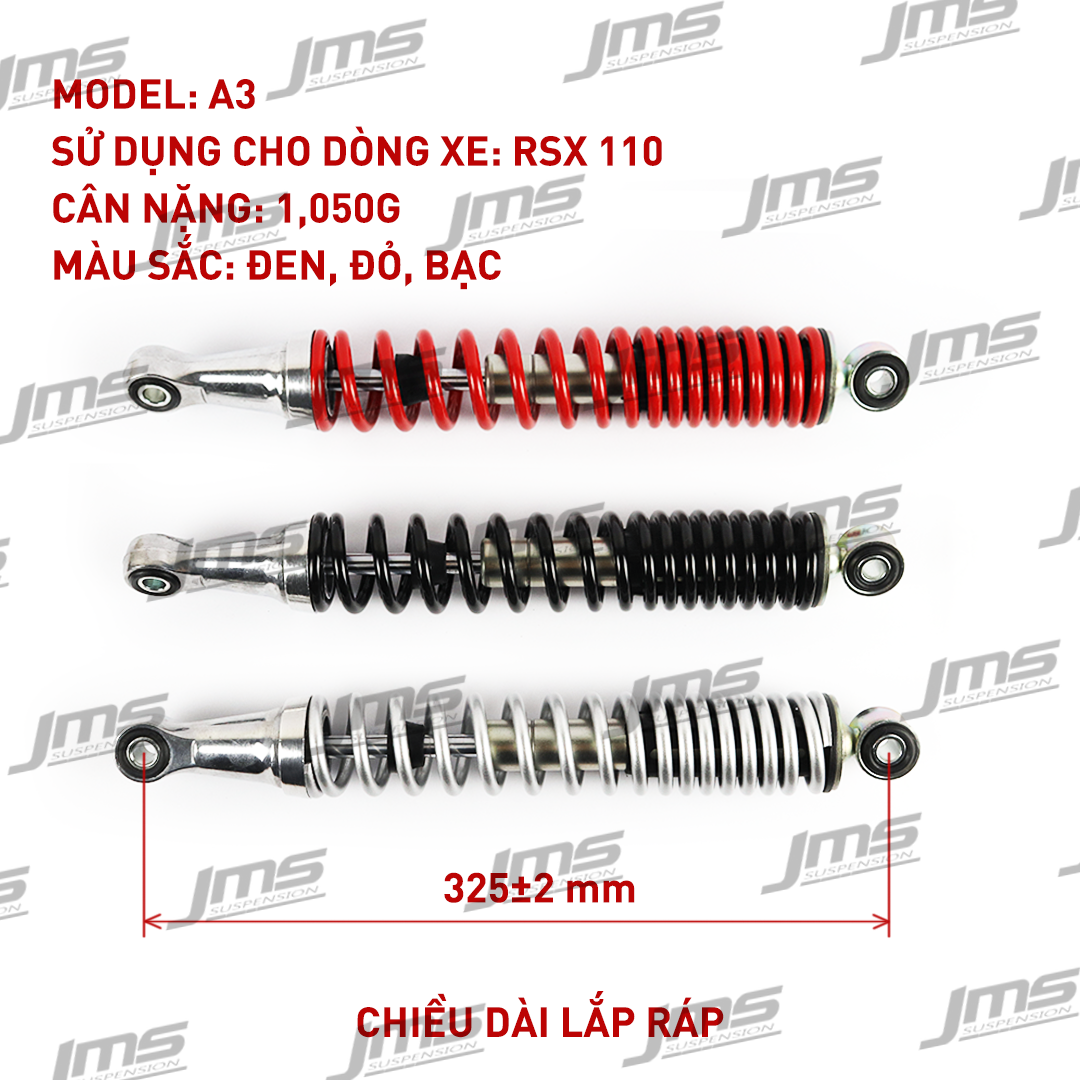 CHIỀU DÀI PHUỘC NHÚN: 325 mm Xuất xứ: Công ty TNHH công nghệ JMS Hàng mới 100% Dây chuyển sản xuất công nghệ Việt - Nhật Các tính năng nổi trội của Phuộc( giảm xóc)