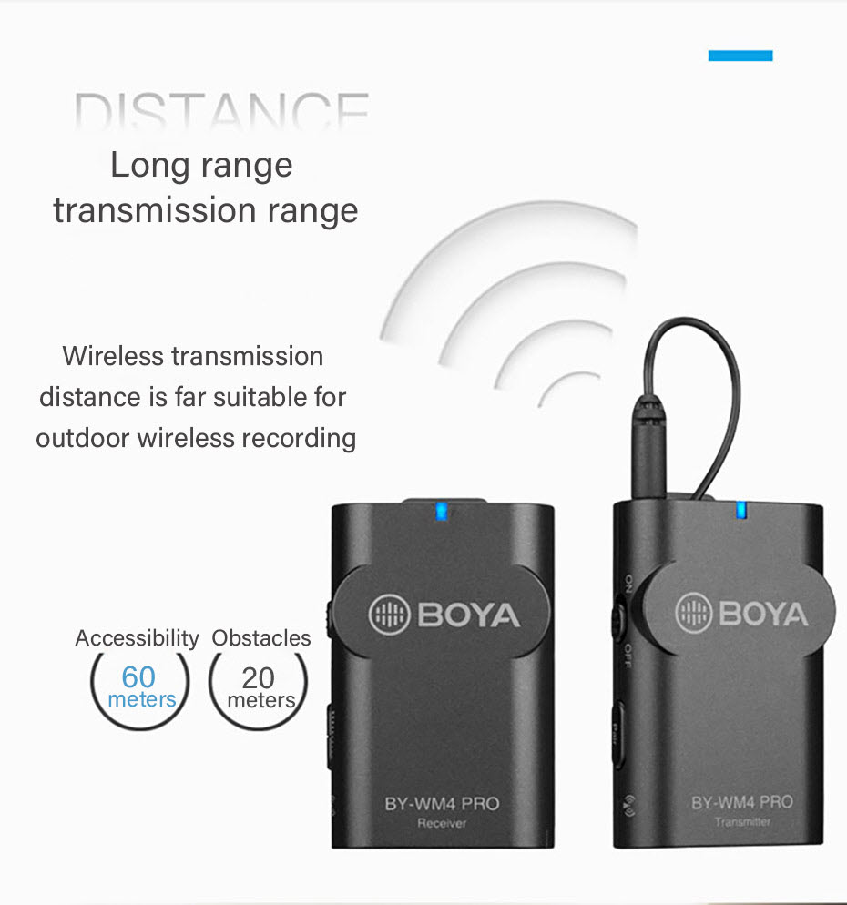 Chất lượng của sản phẩm được cải thiện rất tốt khi có thể loại bỏ tín hiệu tạp âm trên 84 dB, tỉ lệ méo âm thấp dưới 0,05% cho ra chất lượng âm thanh rõ nét. Thời lượng pin của Micro thu âm không dây BY-WM4 đáng kinh ngạc khi có thể sử dụng liên tục trong 13 giờ, khi sử dụng 2 viên pin AAA. Bộ mic này có thể thu được tốt ở khoảng cách tối đa lên tới 60m.