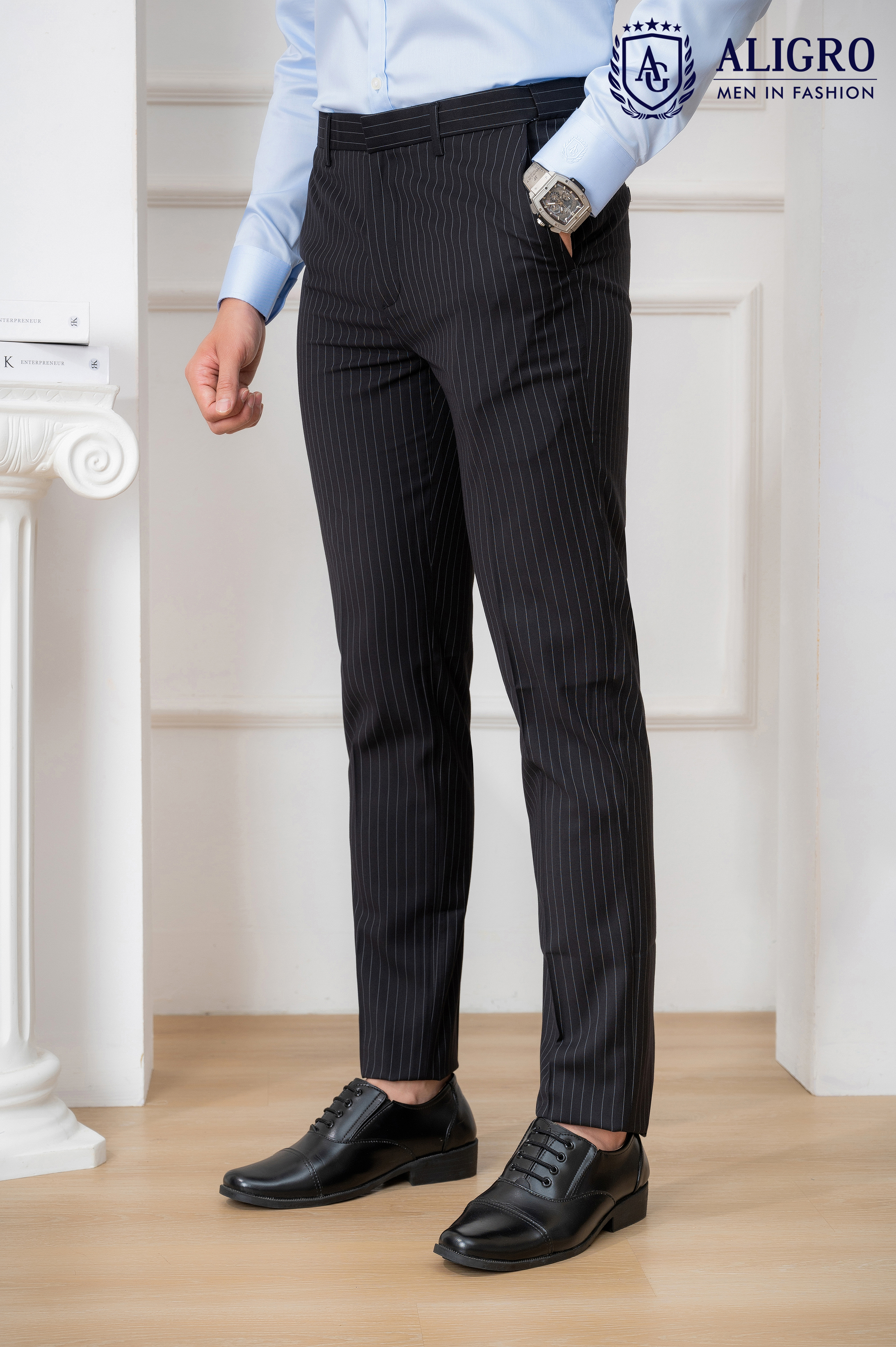 ✨Quần Âu Nam ALIGRO Đen Kẻ Sọc Trắng Form Chuẩn Slimfit, Vải Cotton Cao Cấp Cực Tôn Dáng, Lịch Sự, ALGO1049