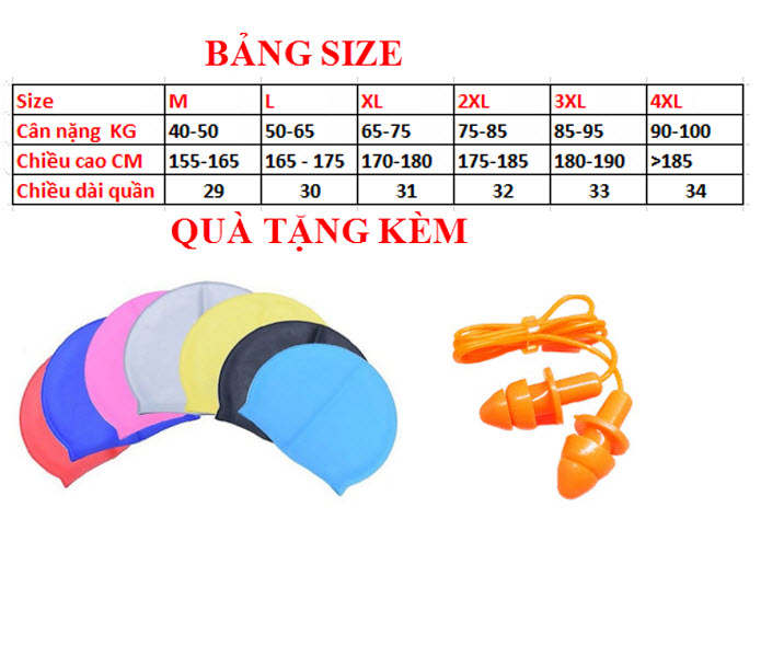 Bộ sản phẩm gồm quần bơi , mũ bơi , bịt tai silicon .