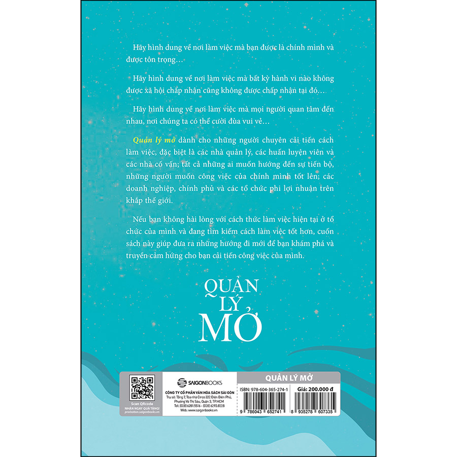 Bằng cách áp dụng toàn bộ các ý tưởng về Con người, Các hệ thống và Sự thích ứng (Human Systems Adaptability), cuốn sách “Quản lý mở” của Tiến sĩ Cherry Vũ và Rob England sẽ khai mở hướng đi mới, đặc biệt cho các nhà quản lý, các huấn luyện viên và các nhà cố vấn, tất cả những ai muốn hướng đến sự cải tiến, sự tiến bộ, những người muốn công việc của chính mình tốt lên; các doanh nghiệp, chính phủ và các tổ chức phi lợi nhuận trên thế giới.