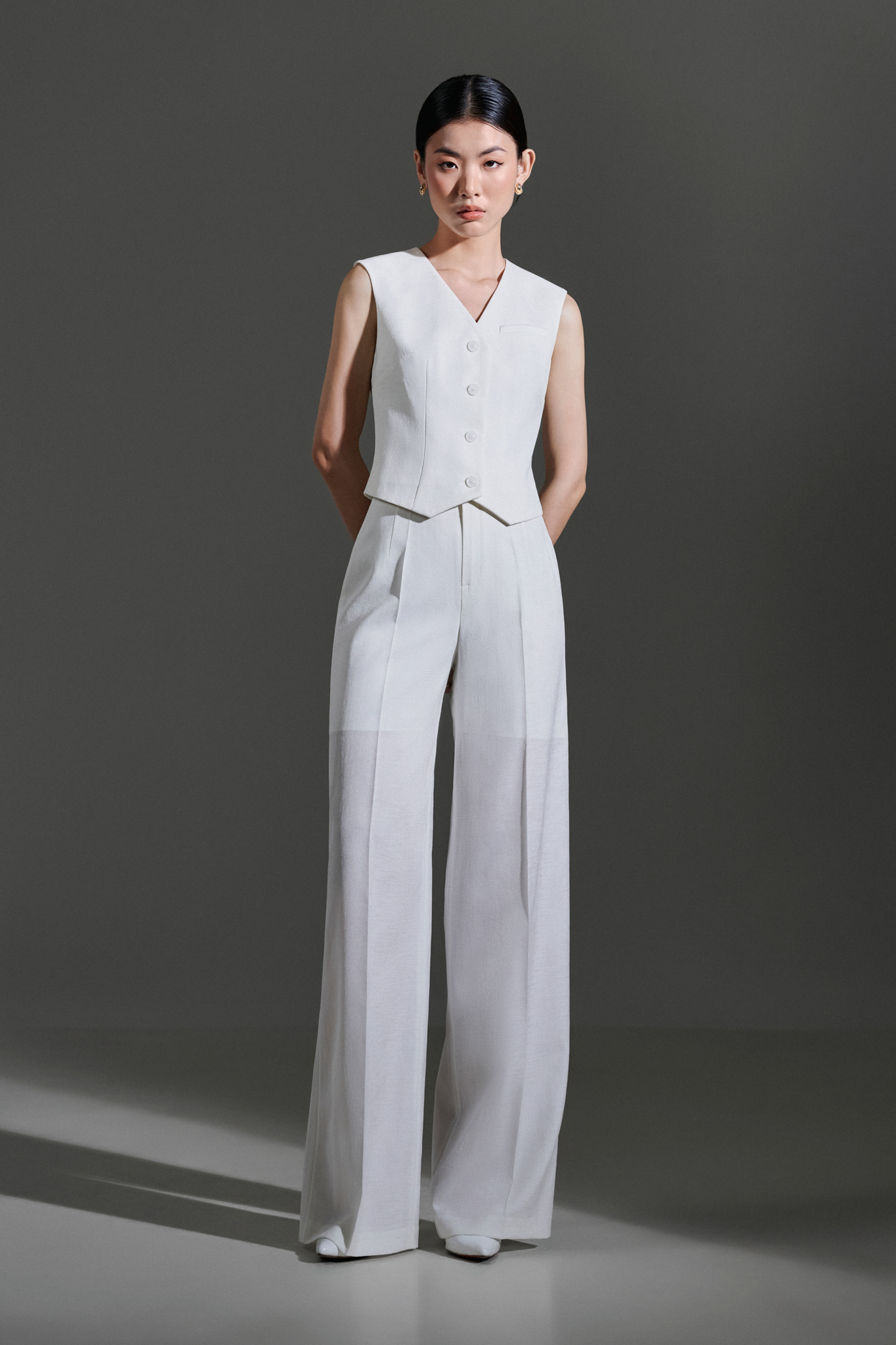 1. Thông tin sản phẩm: VALEN ELOISE - PHONG CÁCH THỜI TRANG CHỈN CHU VÀ CHUYÊN NGHIỆP Áo gile Valen form ôm, phối cùng quần Eloise ống suông cạp cao xếp ly giúp che