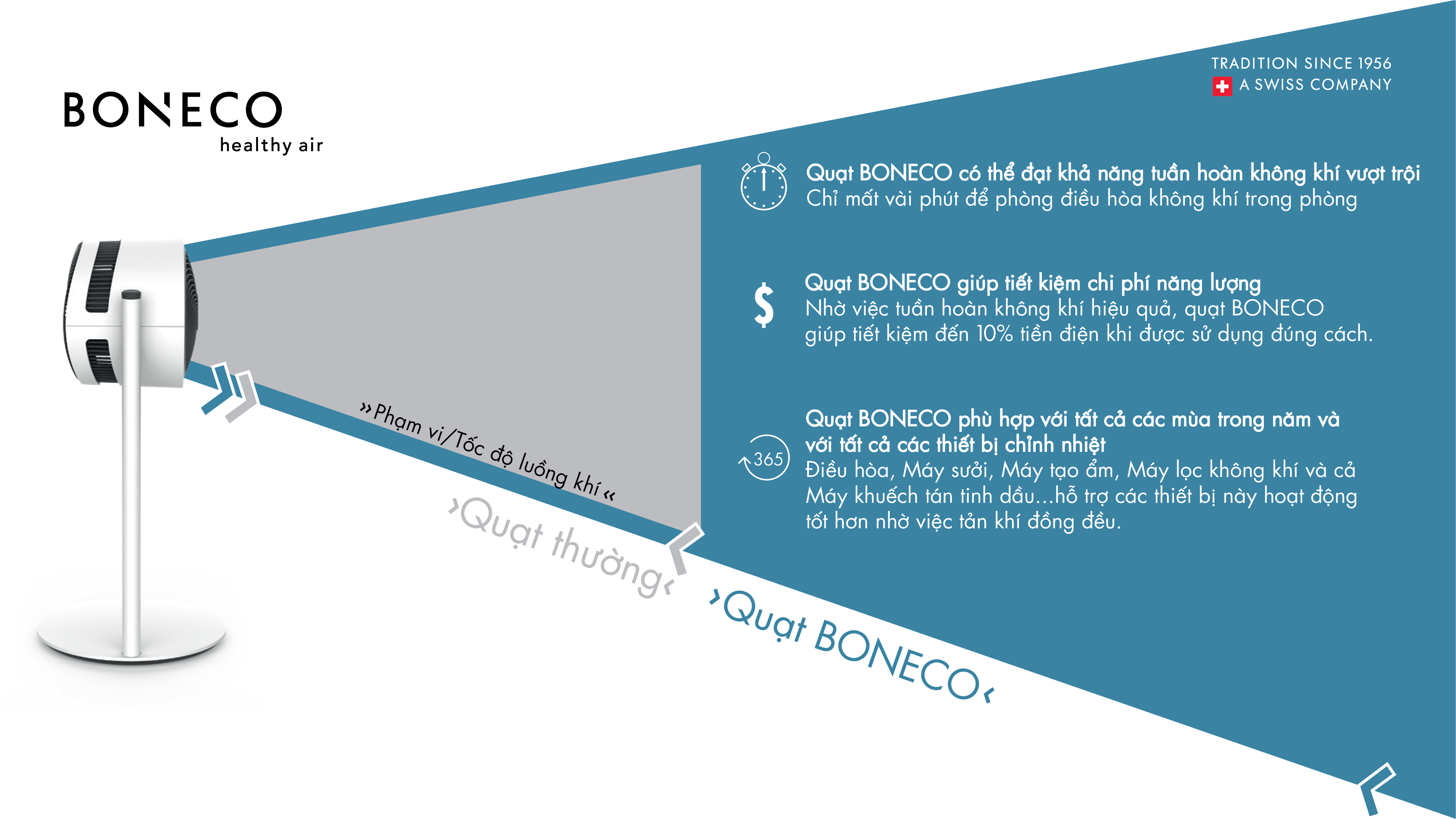 Quạt đối lưu Boneco F230 là một chiếc quạt đa năng đến từ thương hiệu BONECO – Thuỵ sĩ. Đây là sản phẩm hoàn hảo cho không gian phòng ngủ, phòng khách với phong cách thiết kế độc đáo, tính năng ưu việt giúp ngồi nhà bạn trở nên thoáng đãng, gần gũi với thiên nhiên. Boneco F230 với hệ thống làm mát đối lưu như với cơ chế hoạt động điều hoà không khí trong không gian phòng kín có sử dụng điều hoà, quạt điều hoà để cho không khí mát có thể khuếch tán rộng khắp mọi ngóc ngách trong phòng thay vì không khí mát chỉ tập trung vào một điểm. Đối với những không gian mở, quạt đối lưu giúp đẩy những khí nóng ra khỏi không gian, điều chỉnh nhiệt độ về cần bằng tránh cảm giác quá nóng hoặc quá lạnh tập trung vào một điểm dễ gây cảm lạnh, đau đầu. Sự vận hành đối lưu của quạt sẽ giúp cho không khí luôn tươi mát, tránh gây hại cho sức khỏe. Tiết kiệm điện năng hiệu quả Quạt đối lưu F230 được trang bị công nghệ “Energy Star” – Tiêu chuẩn về tiết kiệm năng lượng quốc tế do Cơ quan Bảo vệ môi trường Hoa Kỳ và Bộ năng lượng Hoa kỳ cấp với khả năng tiết kiệm điện lên đến 30%. Ngoài ra với cơ chế hoạt động đối lưu không khí giúp các thiết bị làm mát khác hiệu quả, tiêu hao ít điện năng. Với thiết kế đầu xoay 270 không chỉ mang lại sự vững chắc trong quá trình hoạt động mà còn dễ bố trí, không chiếm diện tích trong phòng. Đầu quạt xoay giúp điều chỉnh luồng không khí nhanh chóng, không cần di chuyển chân quạt. Giá đỡ quạt thiết kế sang trọng, mạnh mẽ, có thể nâng lên, hạ xuống giúp người dùng có thể điều chỉnh độ cao quạt để phù hợp với mọi không gian, diện tích. Điều khiển dễ dàng Trên thân quạt có núm điều khiển có thể xoay vô cùng đơn giản với 4 tốc độ tương ứng với các mức công suất của quạt. Vận hành êm ái, nhanh chóng, đơn giản, yên tĩnh. Thiết kế an toàn với trẻ nhỏ, chắc chắn, chống đổ vỡ. Dễ dàng tháo lắp, vệ sinh. Nhập khẩu hoàn toàn 100% từ Thuỵ Sĩ với chế độ bảo hành lên đến 2 năm và bảo trì trọn đời. Thiết kế đầu xoay 270 độ - Sử dụng linh hoạt Tạo dòng khí đối lưu thông tự nhiên, tạo cảm giác thoải mái.   Tiết kiệm điện năng lên đến 30%.   Thiết kế và kỹ thuật Thuỵ Sĩ độc đáo, sáng tạo, thông minh.   Núm xoay điều khiển 4 tốc độ.   Cấu trúc cột hỗ trợ đặc biệt cho phép thay đổi chiều cao phù hợp với nhu cầu.