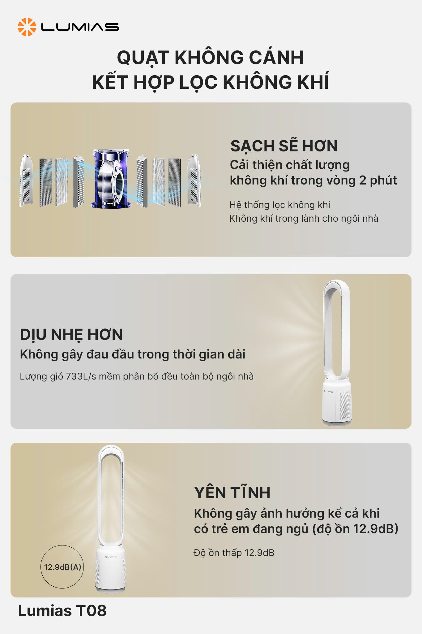 Tên sản phẩm Quạt không cánh Lumias T08 Pro Model T08 Pro Công suất 38W Màu sắc Trắng xám Điện áp 220V, 60Hz Độ ồn Tối thiểu 25dB Chất liệu Nhựa ABS Bộ lọc Bộ