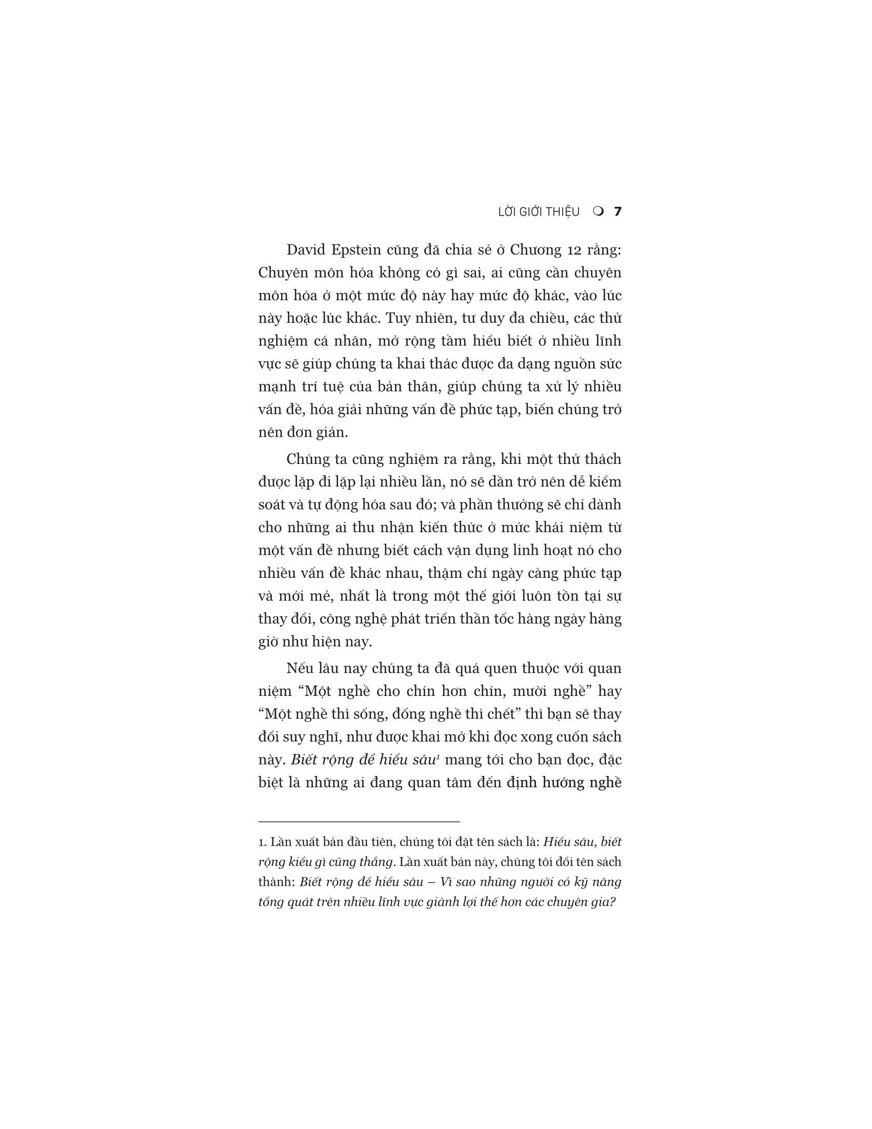 Khiêu khích, khắt khe và hăng say, Biết rộng để hiểu sâu là một trường hợp thuyết phục để tích cực nuôi dưỡng sự kém hiệu quả. Thất bại trong một bài kiểm tra là cách tốt nhất để học hỏi. Những người thường xuyên bỏ cuộc sẽ có được sự nghiệp viên mãn nhất. Các nhà phát minh có sức ảnh hưởng lớn nhất khám phá nhiều lĩnh vực thay vì đào sâu kiến thức trong một lĩnh vực duy nhất. Khi các chuyên gia tự tách m.ình ra xa hơn trong khi máy tính nắm vững nhiều kỹ năng từng dành cho con người có khả năng tập trung cao độ, những người có tư duy rộng rãi và nắm bắt những trải nghiệm và quan điểm đa dạng sẽ ngày càng phát triển.