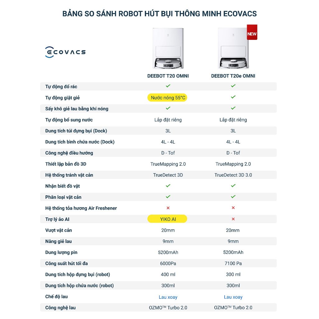 Mua tại TiktokEcovacs T20e Omni là bản rút gọn của T20 Omni đình đám, lược đi trợ lý ảo Yiko và tăng lực hút lên đến 7100Pa. Bảng so sánh các Deebot Ecovacs