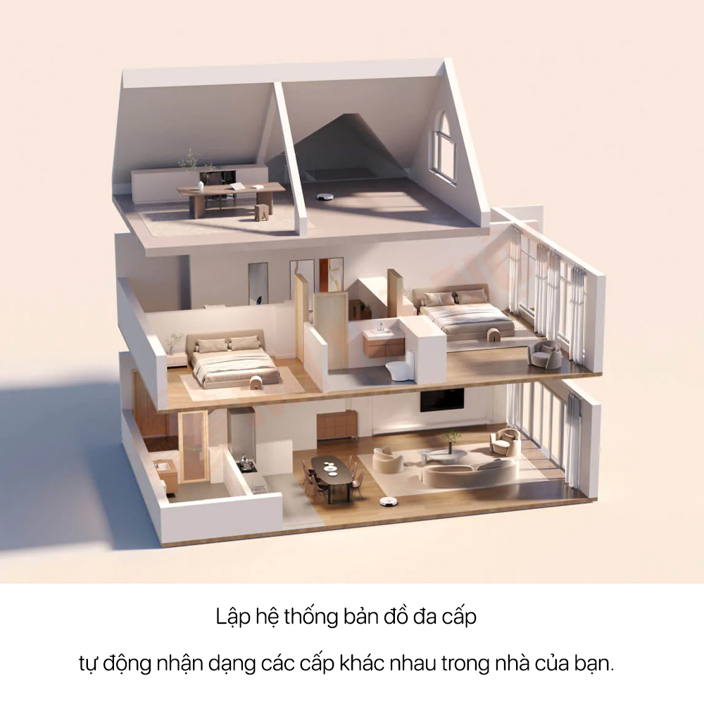 Tích hợp công nghệ Quét laser 3D định vị hệ thống hiển thị bản đồ toàn bộ ngôi nhà. Chốt quét: 2 chiếc Tự động quay về dock sạc, leo dốc 3cm. Thời gian sạc