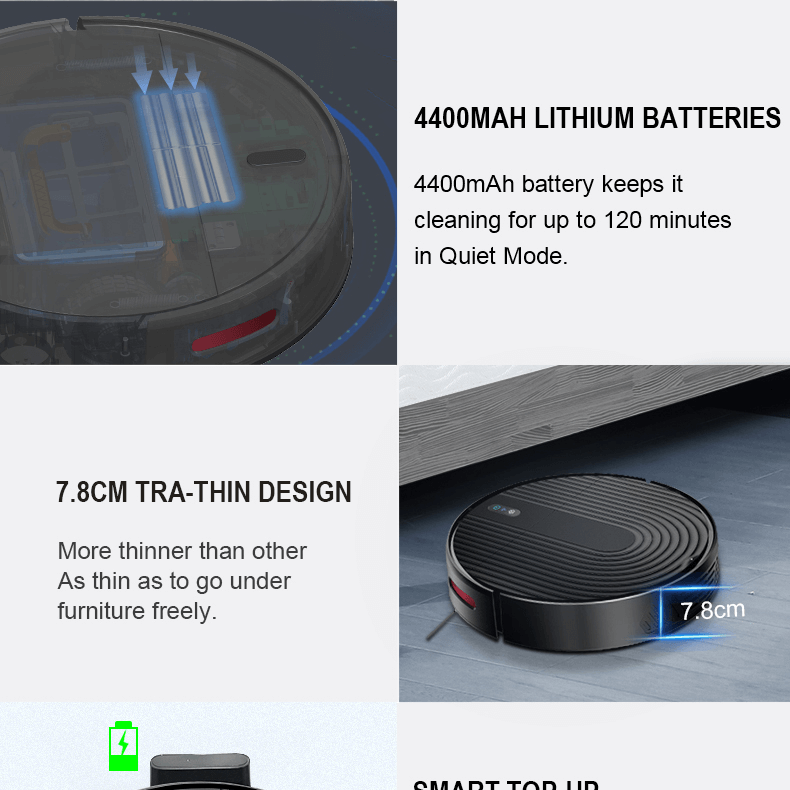 Tích hợp công nghệ Quét laser 3D định vị hệ thống hiển thị bản đồ toàn bộ ngôi nhà. Chốt quét: 2 chiếc Tự động quay về dock sạc, leo dốc 3cm. Thời gian sạc