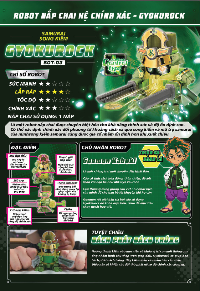 - Kích thước hộp (cm): 17 x 7.2 x 7.2. Đặc điểm nổi bật Robot Nắp Chai Gyokurock Samurai (Chiến Vương Nắp Chai Bottleman BOT-03) là sản phẩm đồ chơi được sản xuất dựa theo bộ phim hoạt hình Chiến Vương Nắp Chai. Trò chơi "Chiến vương nắp chai": Trong không gian ảo của thế giới đồ uống, mọi người sử dụng “Robot nắp chai” để thực hiện các trận đấu với nhau. Tất cả các chiến binh Nắp chai mạnh mẽ đều nhằm mục tiêu trở thành “Chiến vương Nắp chai”.