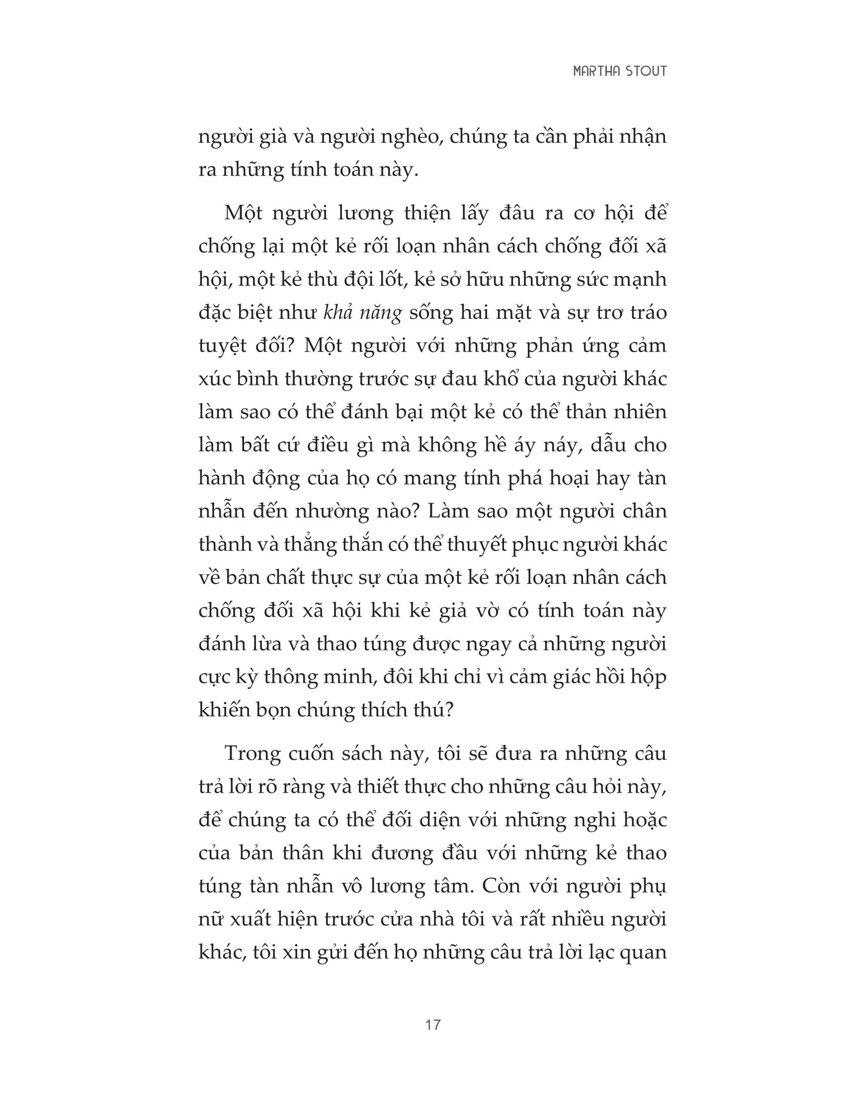 Martha Stout, Ph.D. Giảng viên tâm lý học của khoa Tâm thần học tại Trường Y Harvard trong 25 năm, cộng sự lâm sàng tại Bệnh viện Đa khoa Massachusetts ở Boston. Là tác giả của nhiều cuốn sách như The Sociopath Next Door, The Paranoia Switch, The Myth of Sanity.