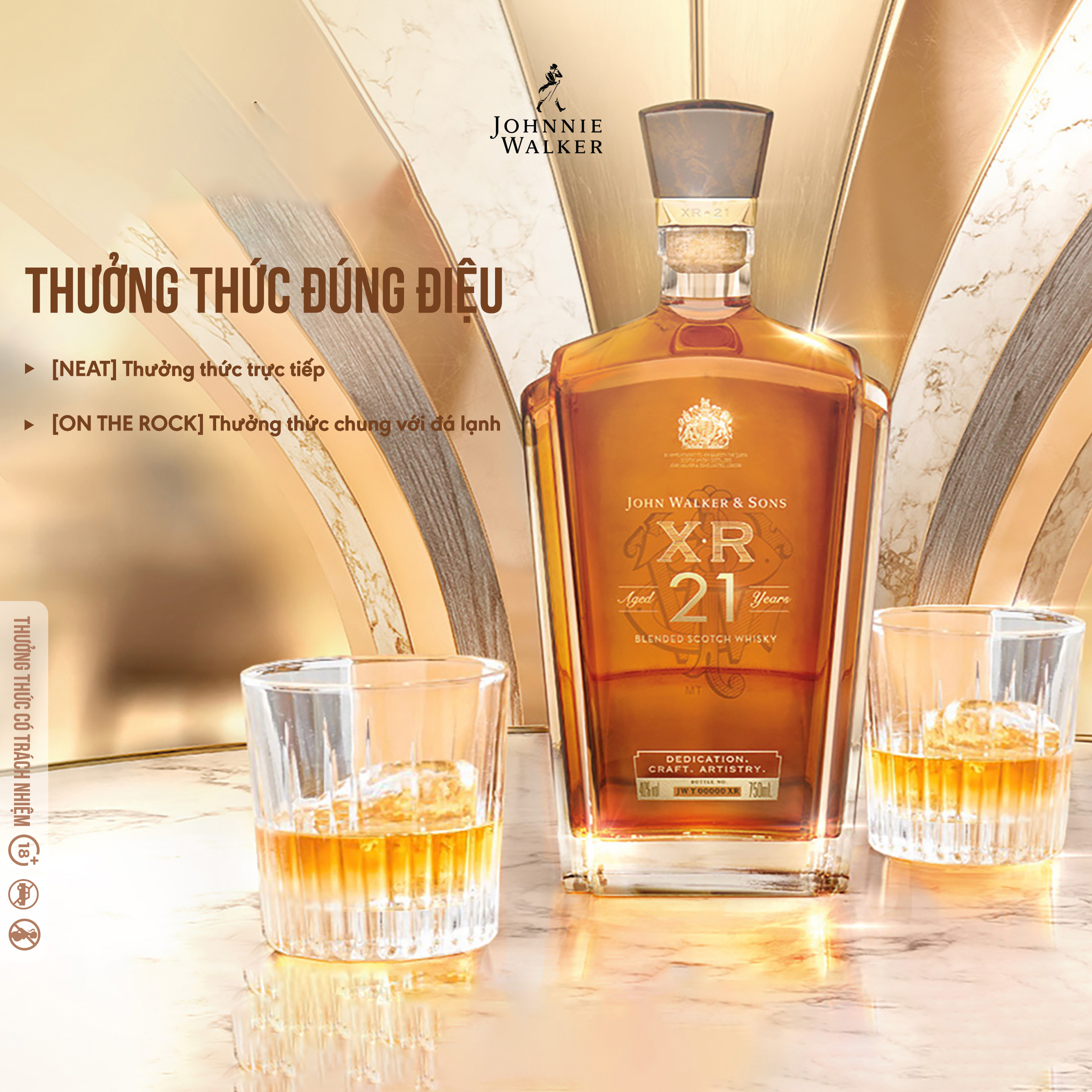 Về Johnnie Walker Johnnie Walker là một nhãn hiệu rượu Whisky Scotland sở hữu bởi Diageo, có xuất xứ từ Kilmarnock, Ayrshire, Scotland. Đây là nhãn hiệu rượu whisky pha Scotland phổ biến rộng rãi nhất trên thế giới, được bán ở hầu khắp các quốc gia với trên 130 triệu chai một năm. Ở Việt Nam, nó còn được biết đến với tên gọi Ông già chống gậy do logo của sản phẩm rượu có hình một người đàn ông với cây gậy. Về Rượu Johnnie Walker John Walker & Sons X.R 21 “Đỉnh cao chế tác” John Walker & Sons X.R 21 năm tuổi ra đời nhân sự kiện Ngài Alexander Đệ Nhị được trao tặng tước hiệu Hiệp Sĩ. Công thức chế tác dựa trên bản viết tay của Ngài Alexander kết hợp các thành phần whisky quý hiếm trưởng thành ít nhất 21 năm. Chất rượu sóng sánh như vàng, mang hương vị cân bằng, mạnh mẽ và thanh tao. Những lớp hương đậm đà mang đến nhiều điều ngạc nhiên. Được mệnh danh là đỉnh cao chế tác, chính bởi chất vị cân bằng và thanh tao bậc nhất, ẩn chứa những giá trị lịch sử. Được chưng cất ít nhất 21 năm và được tạo nên từ những thùng chưng cất rượu quý hiếm hiện đã không còn được sản xuất Được chế tác theo công thức viết tay của Ngài Alexander Walker Đệ II nhân sự kiện ông được phong tặng tước hiệu Hiệp sĩ Hoàng gia Anh Được áp dụng phương pháp phối trộn 3 giai đoạn độc nhất MÙI VỊ & HƯƠNG VỊ: • Hương: Hương Kem mềm mại, Vanilia. Vị ngọt ngào của Cam, Caramen, Nho khô. • Vị: mật ong ngọt ngào, gây ấn tượng bằng gia vị cay nồng ướp trong làn khói hương mờ ảo. • Hậu vị: kéo dài dịu êm trong hương gỗ sồi và đáng nhớ với một ít vị Khói. John Walker & Sons X.R 21 năm tuổi là loại whisky đặc biệt được chế tác dựa trên bản viết tay của Ngài Alexander Đệ Nhị, Với hương vị cân bằng, mạnh mẽ và thanh tao, hương kem mềm mại, vanilia, vị ngọt ngào của cam, caramen, nho khô và hậu vị kéo dài dịu êm trong hương gỗ sồi và đáng nhớ với một ít vị khói. THÀNH PHẦN - NGUYÊN LIỆU: John Walker & Sons X.R 21 là một loại rượu whisky cao cấp được ủ trong thùng gỗ sồi ít nhất 21 năm, mang đến hương vị và mùi thơm đặc trưng của whisky cùng với hương vị ngọt ngào của vani, trái cây chín mọng và gia vị ấm áp. Đây là lựa chọn tuyệt vời cho những người yêu thích rượu whisky cao cấp và muốn thưởng thức những hương vị độc đáo và tinh tế. HƯỚNG DẪN SỬ DỤNG & THƯỞNG THỨC: • Thưởng thức neat (uống trực tiếp) • On the rock (uống với đá) Thưởng thức nguyên bản hoặc cùng chút đá lạnh là lựa chọn tuyệt vời để thăng hoa vị giác qua từng tầng hương Sản phẩm dành cho đối tượng trên 18 tuổi, vui lòng thưởng thức trách nhiệm cùng Johnnie Walker.