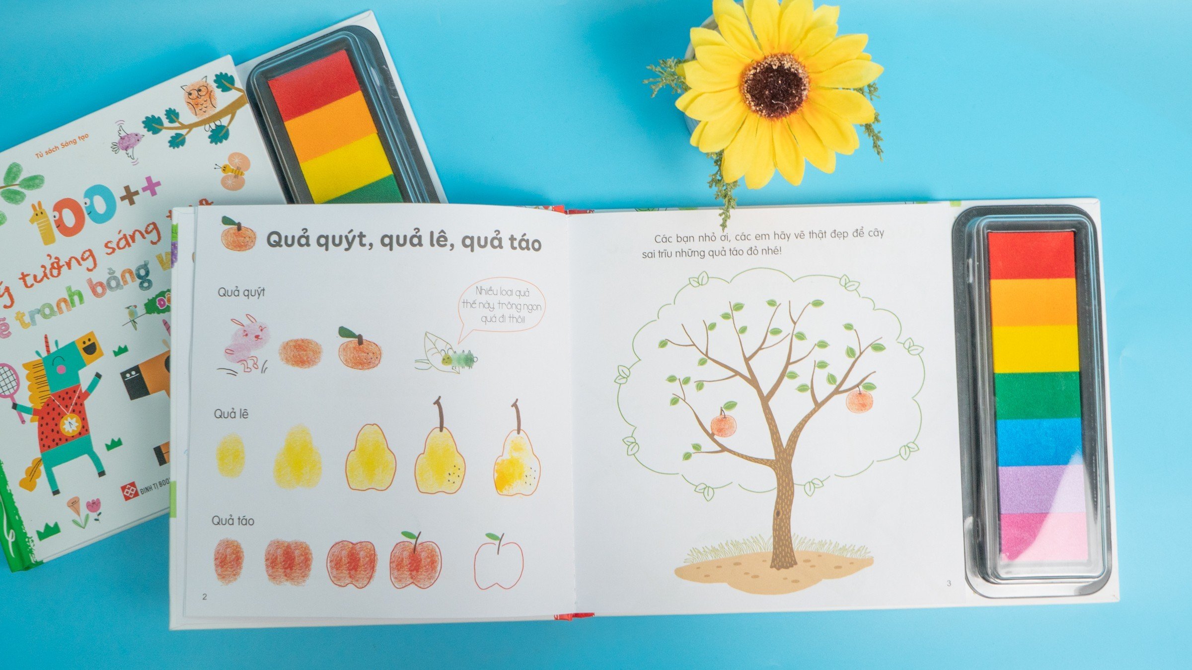 Với bộ sách 100++ ý tưởng sáng tạo vẽ tranh bằng vân tay, mỗi ngón tay xinh của các em sẽ là một “cây cọ vẽ” để sáng tạo nên cả thế giới mà chẳng cần đến những nguyên vật liệu lỉnh kỉnh. Cũng chẳng đòi hỏi các “họa sĩ nhí” phải quá khéo tay, chỉ cần các thao tác vô cùng đơn giản, thêm họa tiết, thêm màu sắc, thế là các loài động vật đáng yêu như gà, vịt, cú mèo, voi, cá… hay các loài thực vật quen thuộc như táo, nho, dâu tây, bắp cải, hoa hồng, hoa sen… đã hiện ra hết sức sống động rồi đấy!